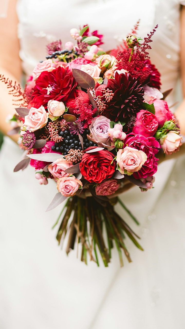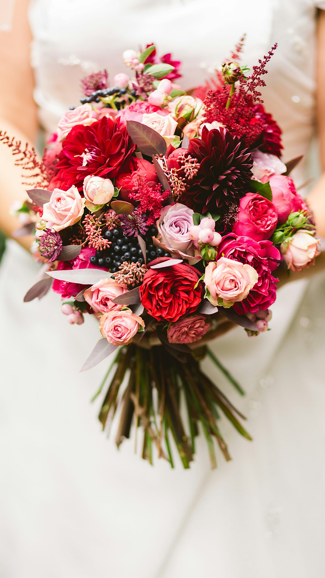 This wallpaper features a stunning bride holding a breathtaking flower bouquet. The image is perfect for adding a touch of elegance and romance to your devices. The vibrant colors and intricate details of the flowers create a captivating scene.