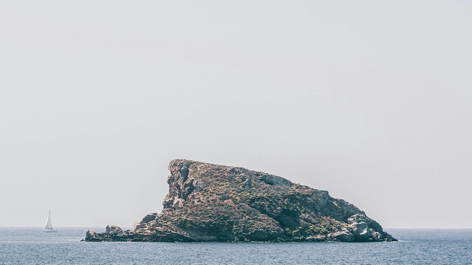 Wallpaper Brown and Green Rock Formation on Sea Under White Sky