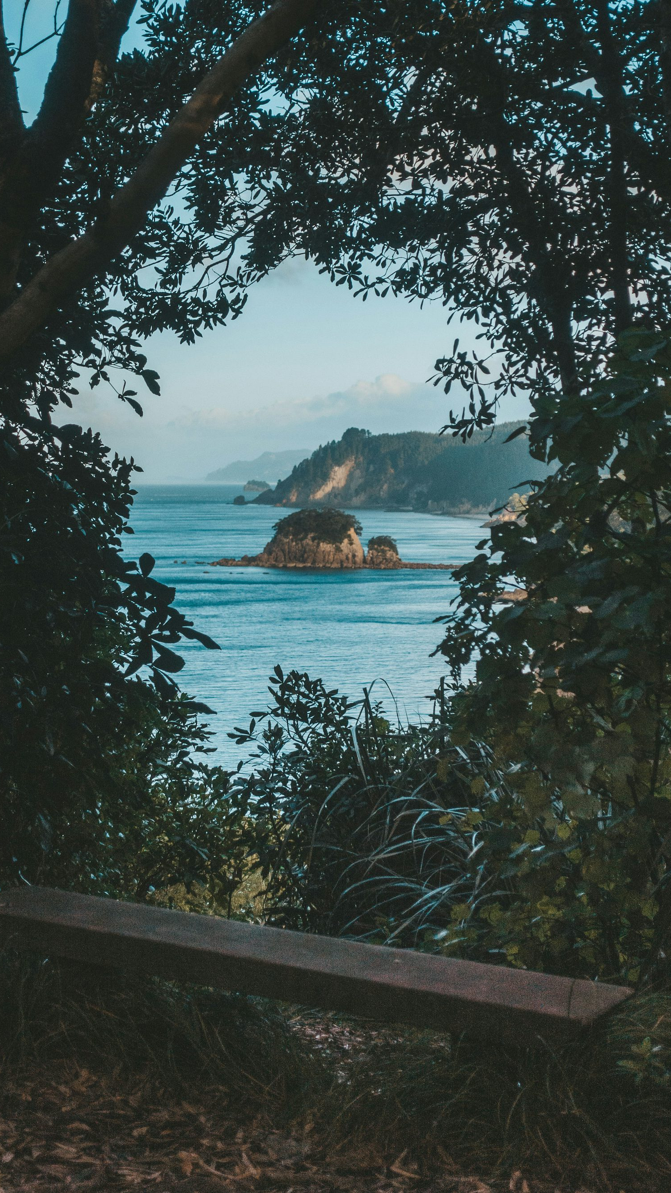 Keywords: brown bench, wooden bench, park bench, trees, sea, ocean, coast, beach, nature, landscape, outdoor, scenery, tranquil, serene, relaxation
