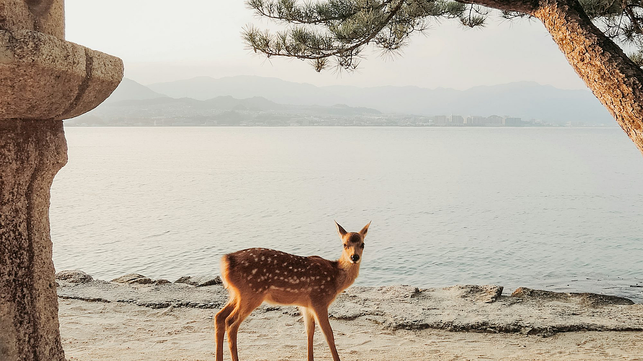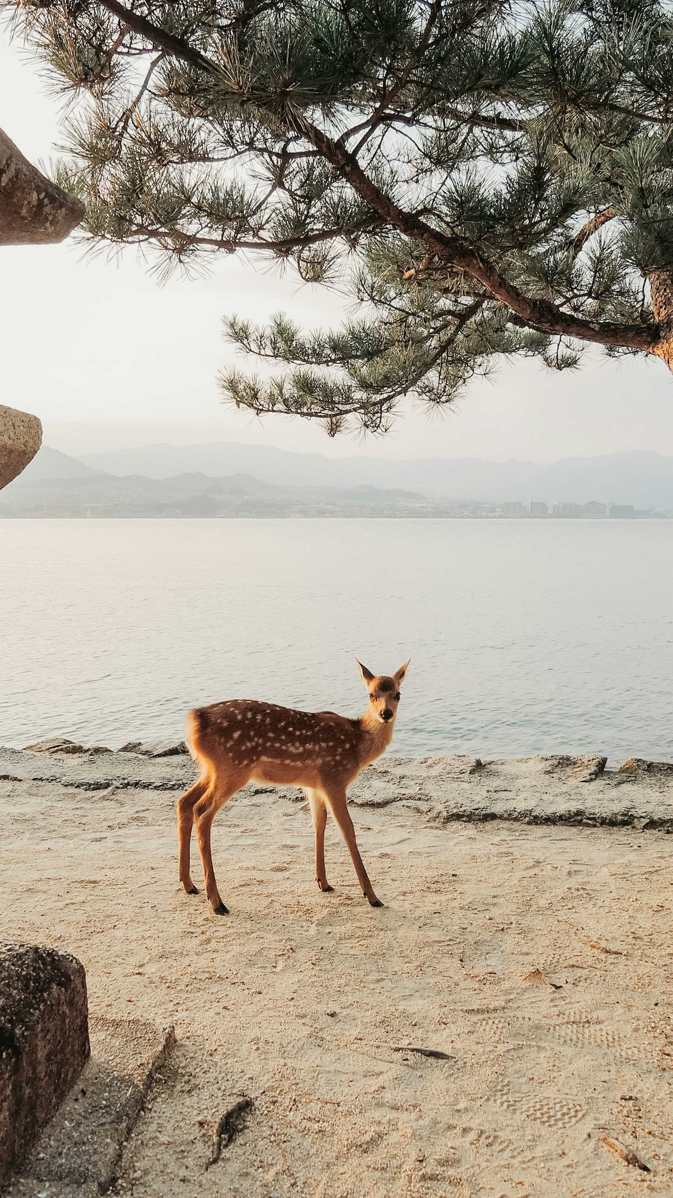 brown deer, deer, brown sand, sand, water, body of water, lake, river, seashore, coast, wildlife, animal, nature, landscape, daytime