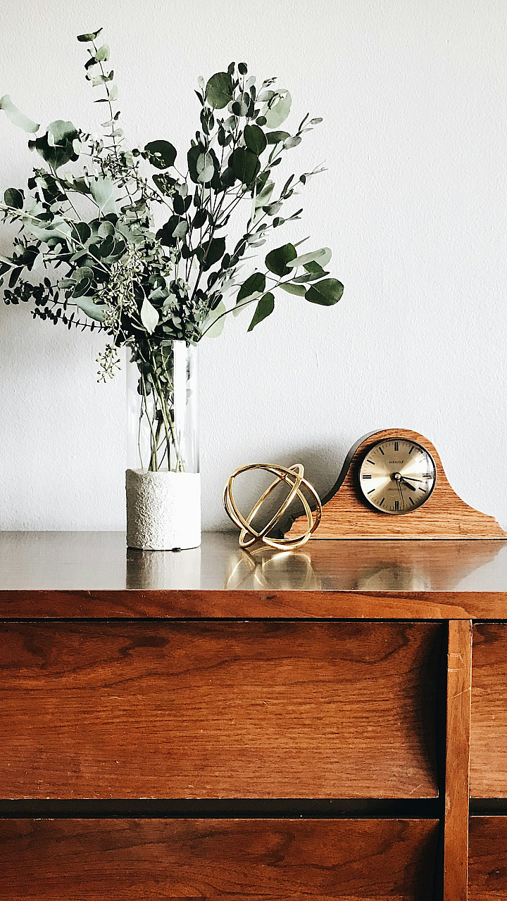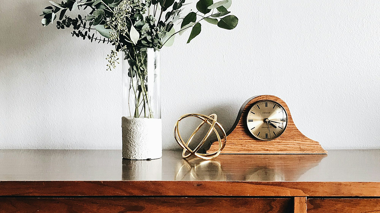 brown wooden frame, analog clock, mantle clock, gray flowers, flower centerpiece, wooden clock, vintage clock, timepiece, home decor, interior design, grey petals, rustic decor, floral arrangement, clock wallpaper, brown wallpaper
