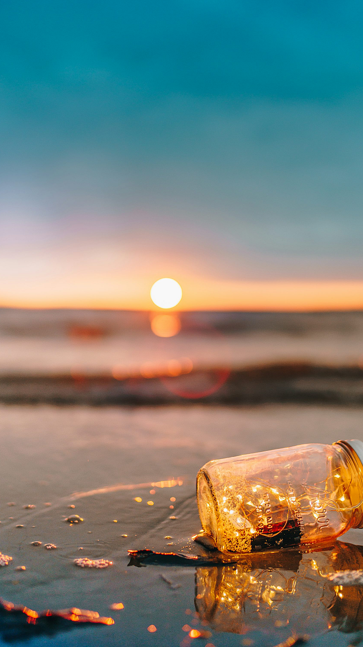 The simple composition of the mason jar against the vast ocean backdrop creates a captivating contrast. The warm hues of the golden hour illuminate the scene, highlighting the details of the sand and the delicate reflection of the sky in the glass. The image is perfect for those seeking a calming and inspirational wallpaper for their devices.
