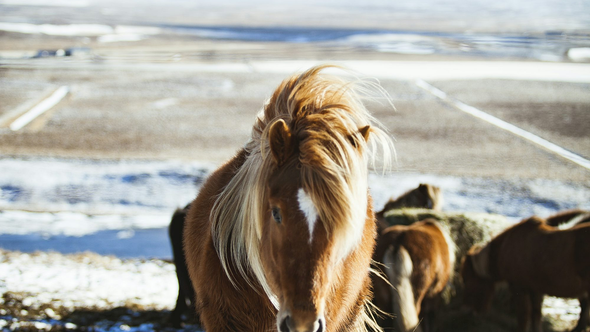 This stunning wallpaper features a close-up photograph of a brown horse majestically walking in the foreground, with a breathtaking ice-capped mountain as a backdrop. The image showcases the raw beauty of nature, highlighting the contrast between the warm tones of the horse’s coat and the cool, crisp white of the mountain.