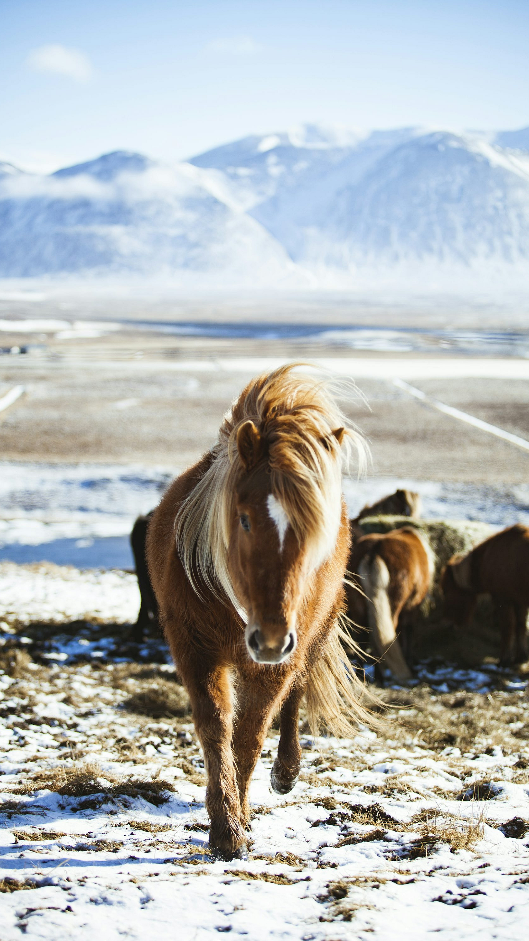 Keywords: brown horse, horse, equine, mammal, mountain, ice-capped mountain, snowy mountain, glacier, landscape, nature, wildlife, close-up, photography, walking, majestic