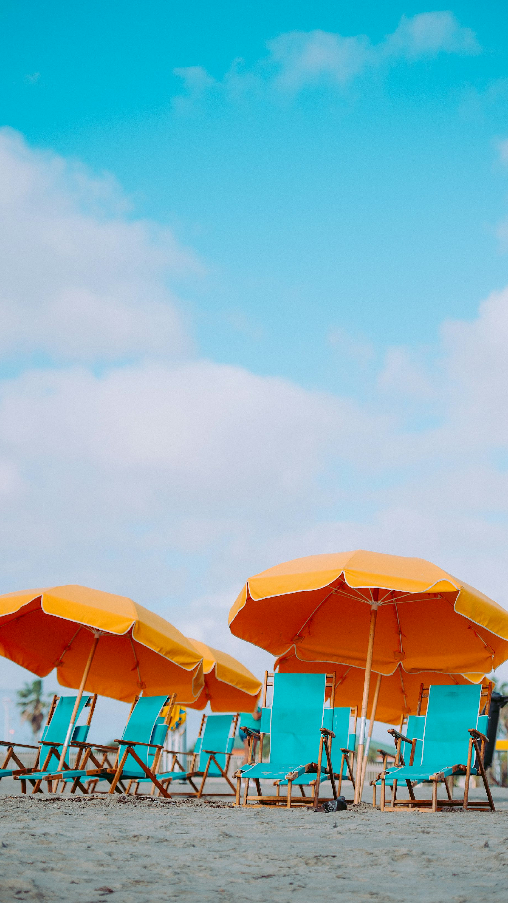 This wallpaper features a stunning closeup image of comfortable lounger chairs and vibrant beach umbrellas, perfectly capturing the essence of a relaxing beach day. The detailed image offers a sense of tranquility and escape, ideal for bringing a vacation vibe to any digital device. The vibrant colors and sharp details make this wallpaper a perfect choice for those seeking a peaceful and aesthetically pleasing background.