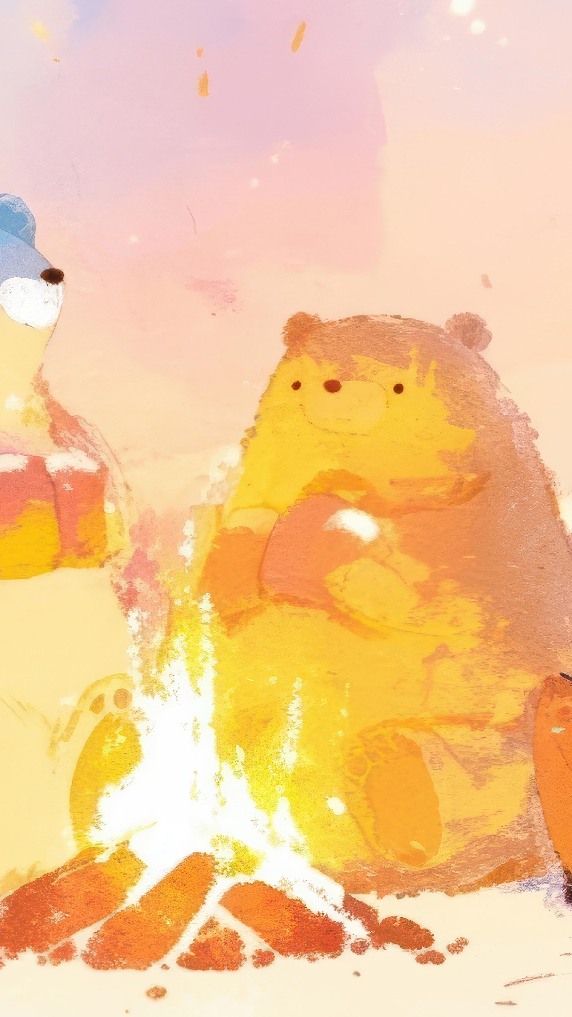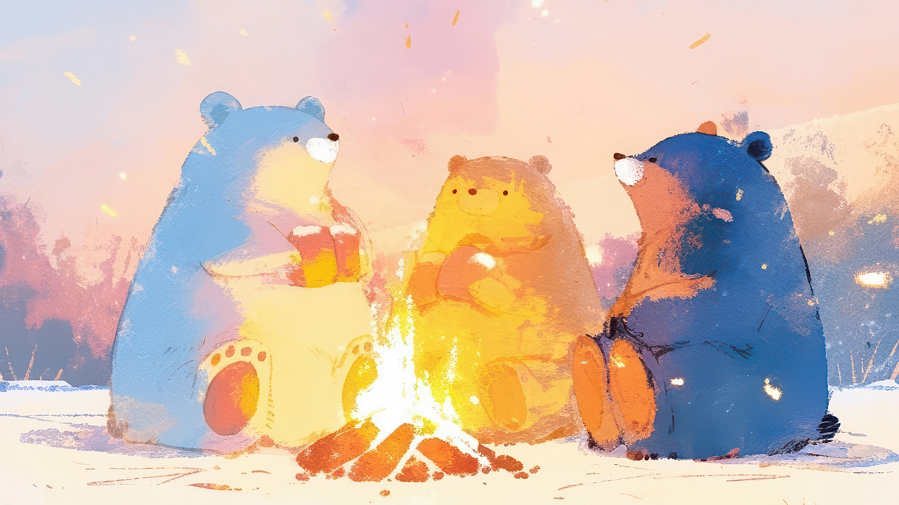 cute bears, anime art, campfire, wallpaper, background, adorable, kawaii, animals, fire, night, forest, cartoon, illustration, whimsical, scenic