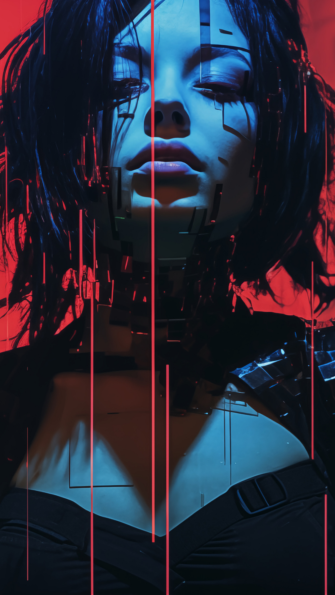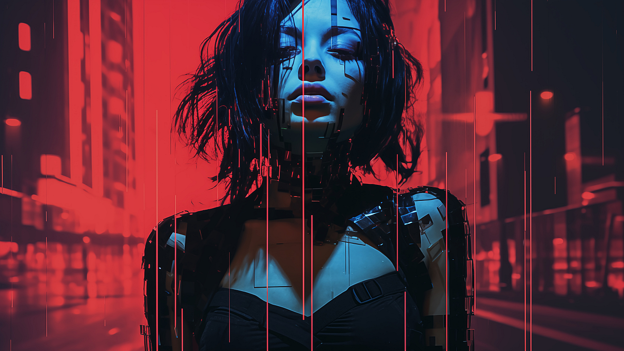 Cyberpunk, Girl, Glitch, Digital Art, Sci-Fi, Fantasy, Neon, Future, Technology, Cybernetic, Artificial Intelligence, AI, Retrofuturism, Distorted, Abstract