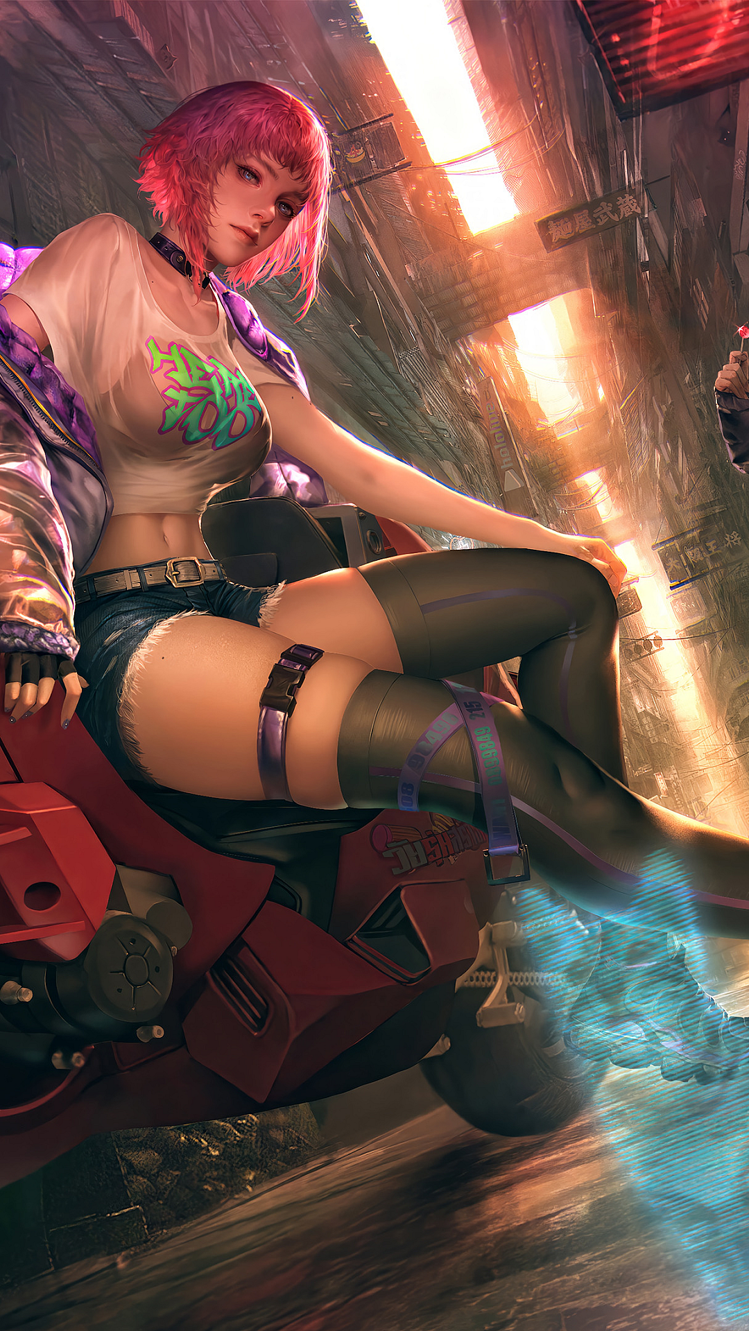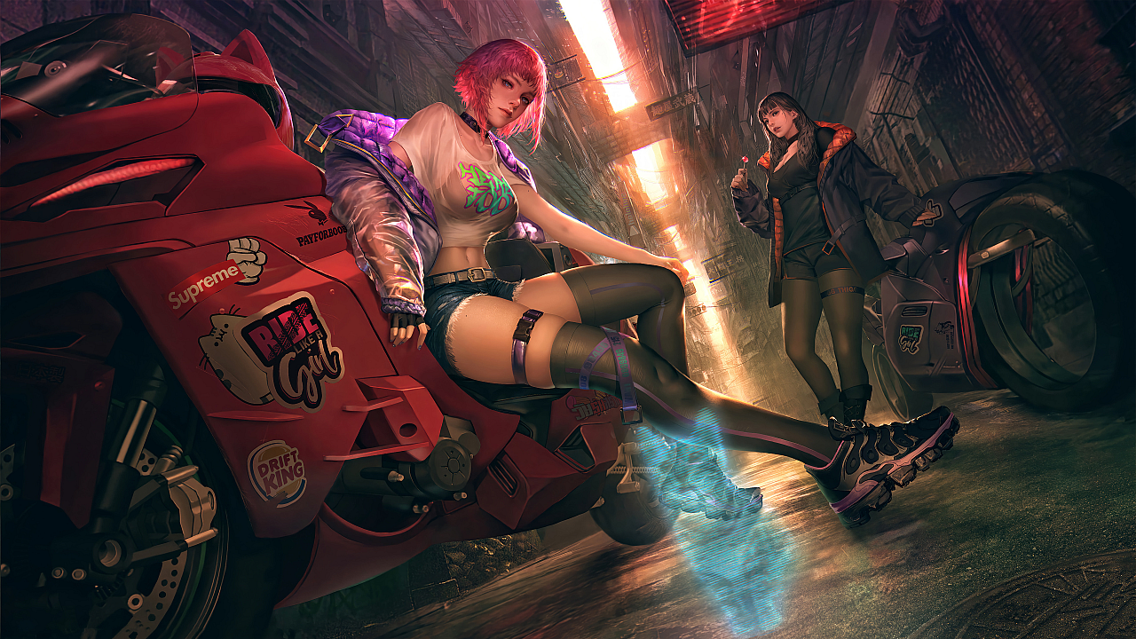 Wallpaper Cyberpunk Girls Motorcycle Sci-Fi