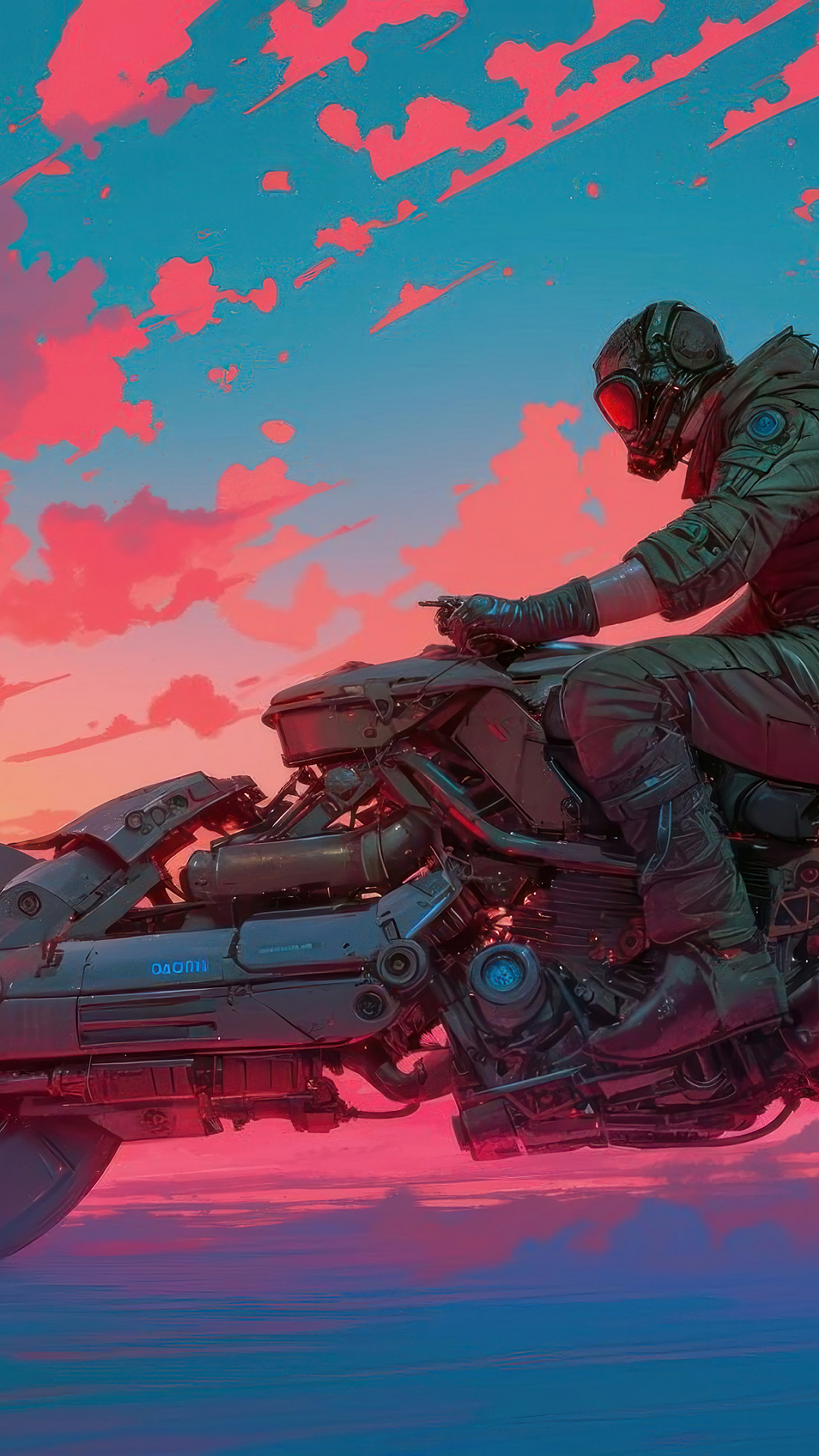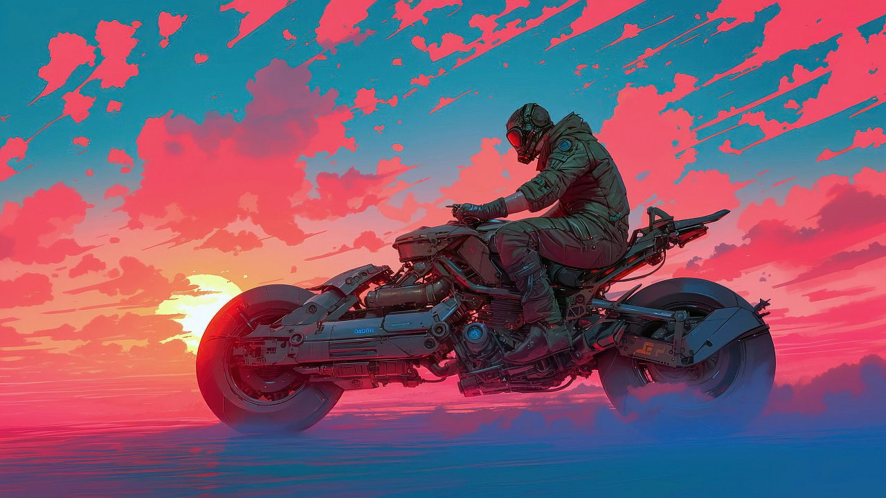 Cyberpunk, Motorcycle, Sunset, Wallpaper, Background, Digital Art, Neon, Cityscape, Night, Sci-Fi, Bike, Futuristic, Chrome, Grunge, Dystopian