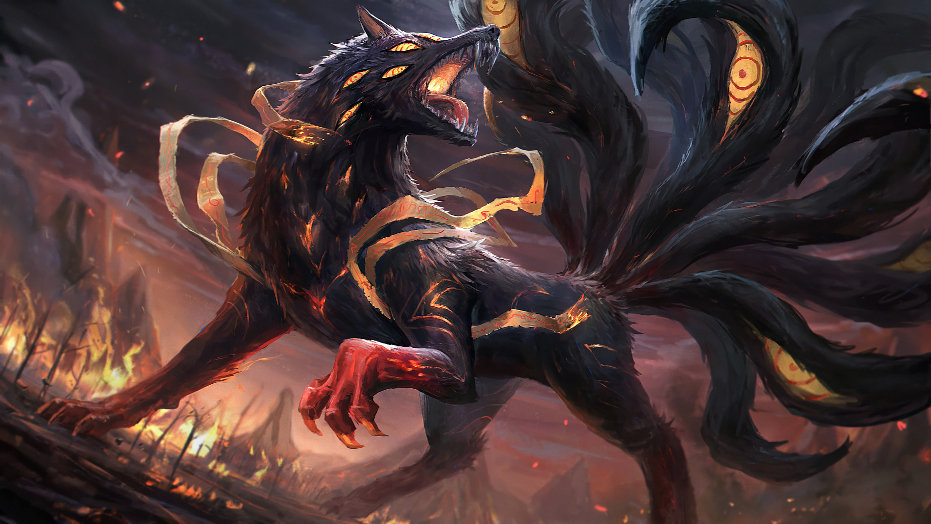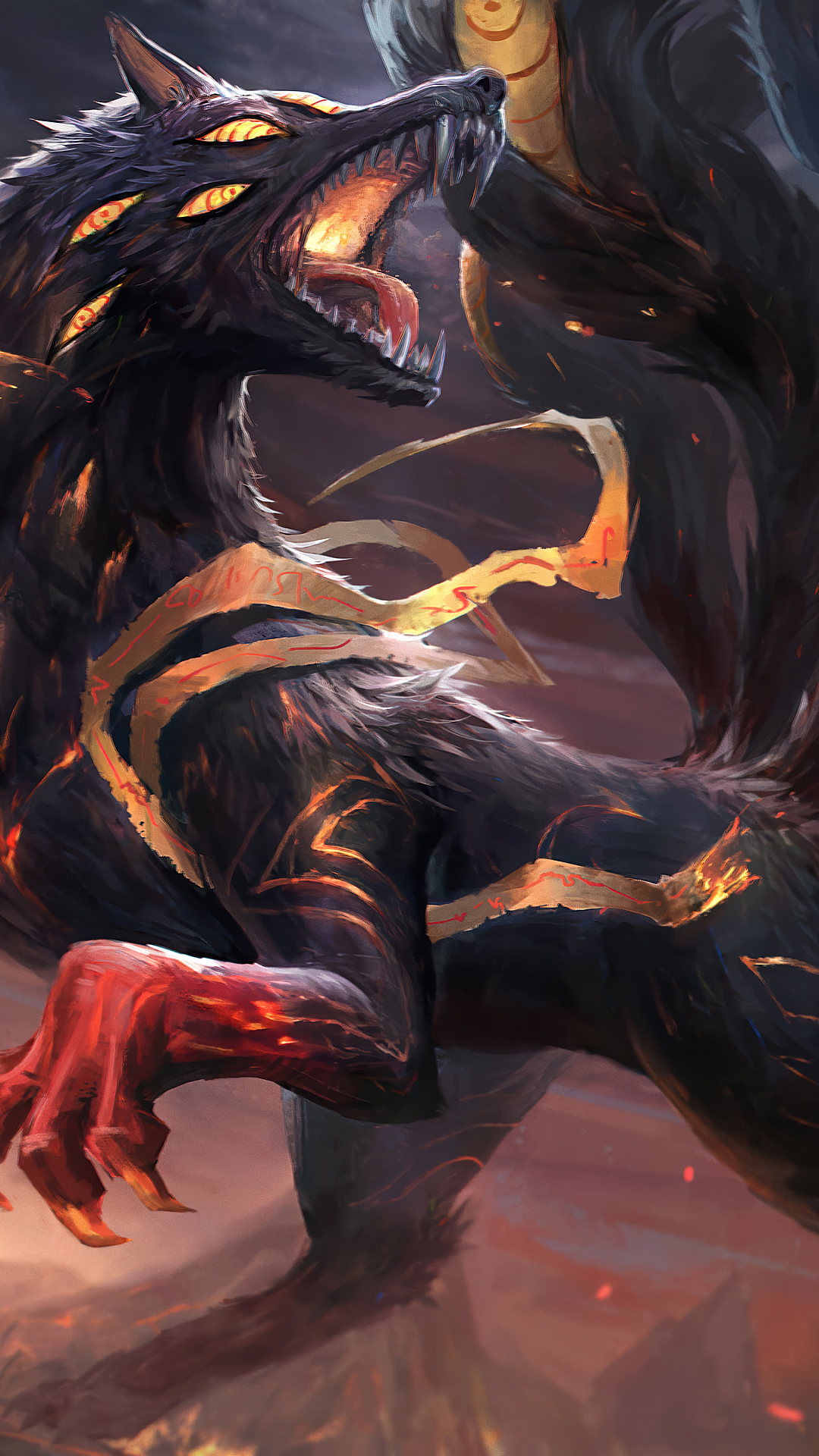 This wallpaper features a captivating illustration of a demon fox, also known as a kitsune, a creature from Japanese folklore. The image blends elements of dark fantasy and mystical imagery, creating a visually striking and atmospheric scene. The demon fox is depicted with intense detail, showcasing its magical abilities and supernatural presence. This piece is perfect for those who appreciate dark fantasy art, mythical creatures, and Japanese folklore.