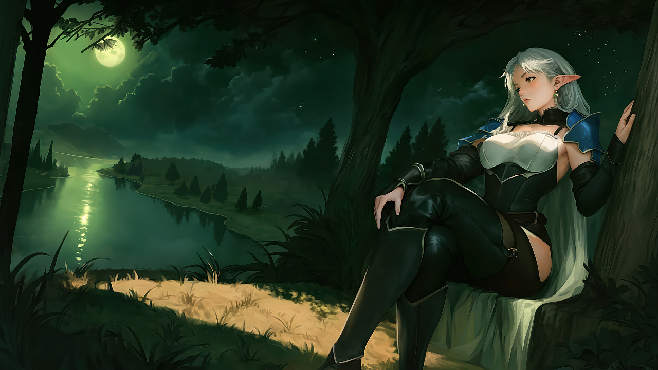 This stunning wallpaper features a beautiful elf girl bathed in the silvery light of a night moon. The scene is filled with fantasy elements, creating a magical and dreamy atmosphere. Perfect for adding a touch of whimsical enchantment to your desktop or mobile device.