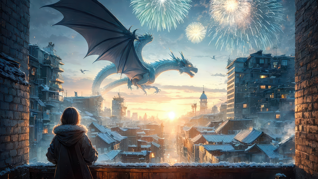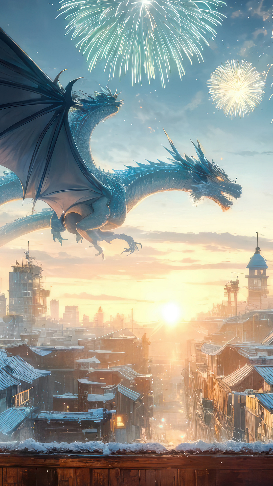 The dragon’s scales shimmer in the dawn light, catching the radiant hues of the fireworks and the rising sun. The image is rich in detail, capturing the intricate design of the creature’s wings and the explosive energy of the fireworks display. It’s a perfect blend of fantasy and breathtaking natural beauty, making it an ideal wallpaper for anyone who appreciates spectacular and vibrant imagery.