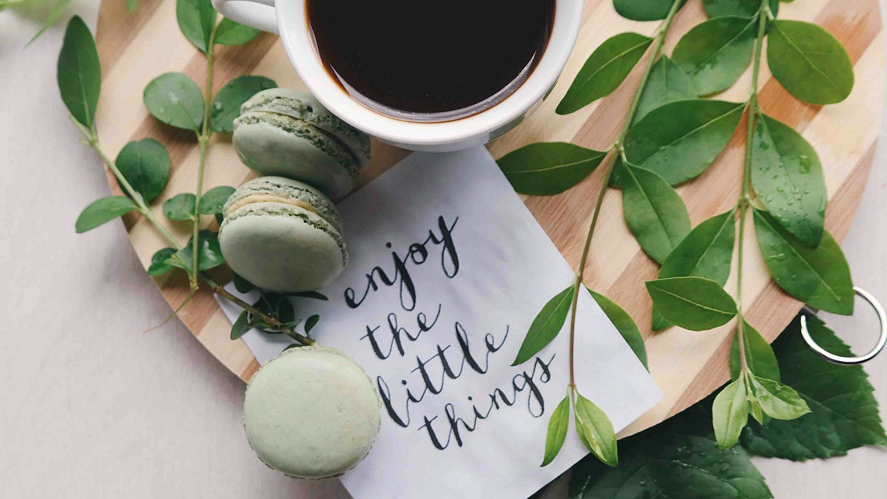 flat lay photography of leaves with cup of coffee and three macarons on chopping board