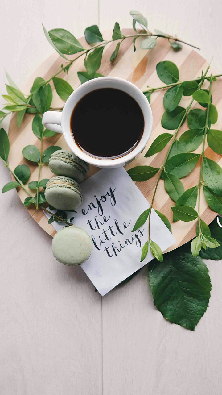 Wallpaper Flat Lay Photography of Leaves, Coffee, and Macarons