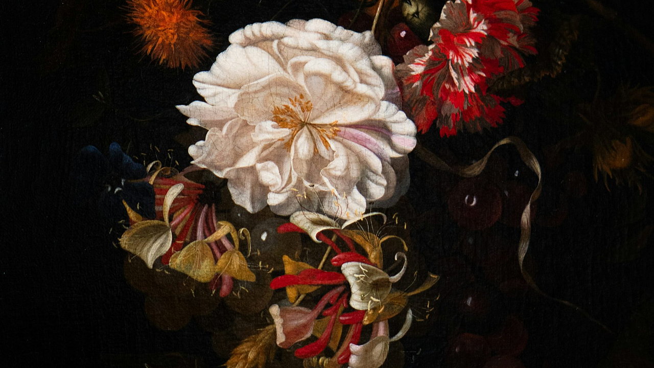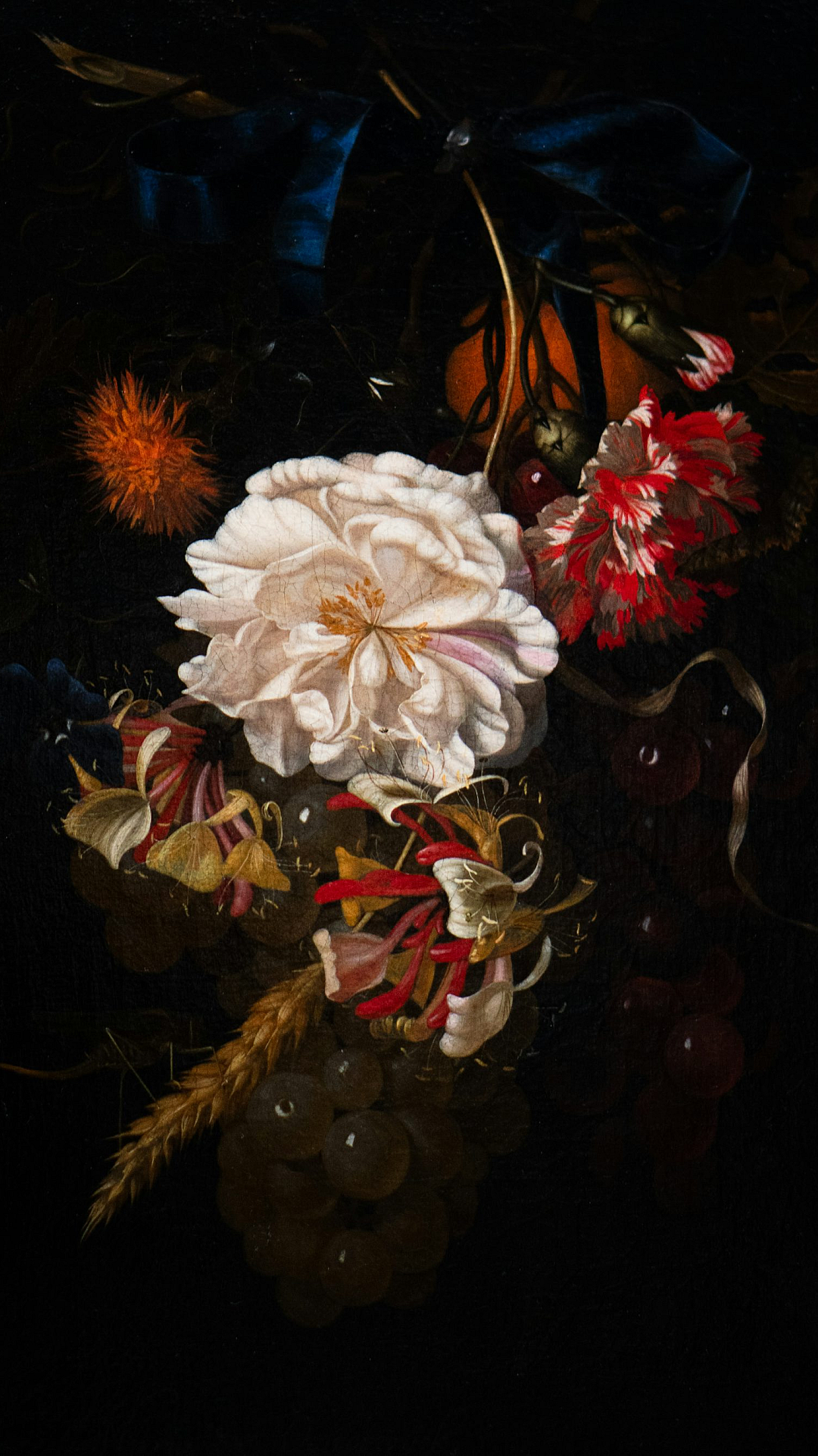 Flowers, Grapes, Still Life, Dark, Painting, Artwork, Floral, Fruit, Dark Background, Vintage, Antique, Elegant, Dramatic, Shadowy, Moody