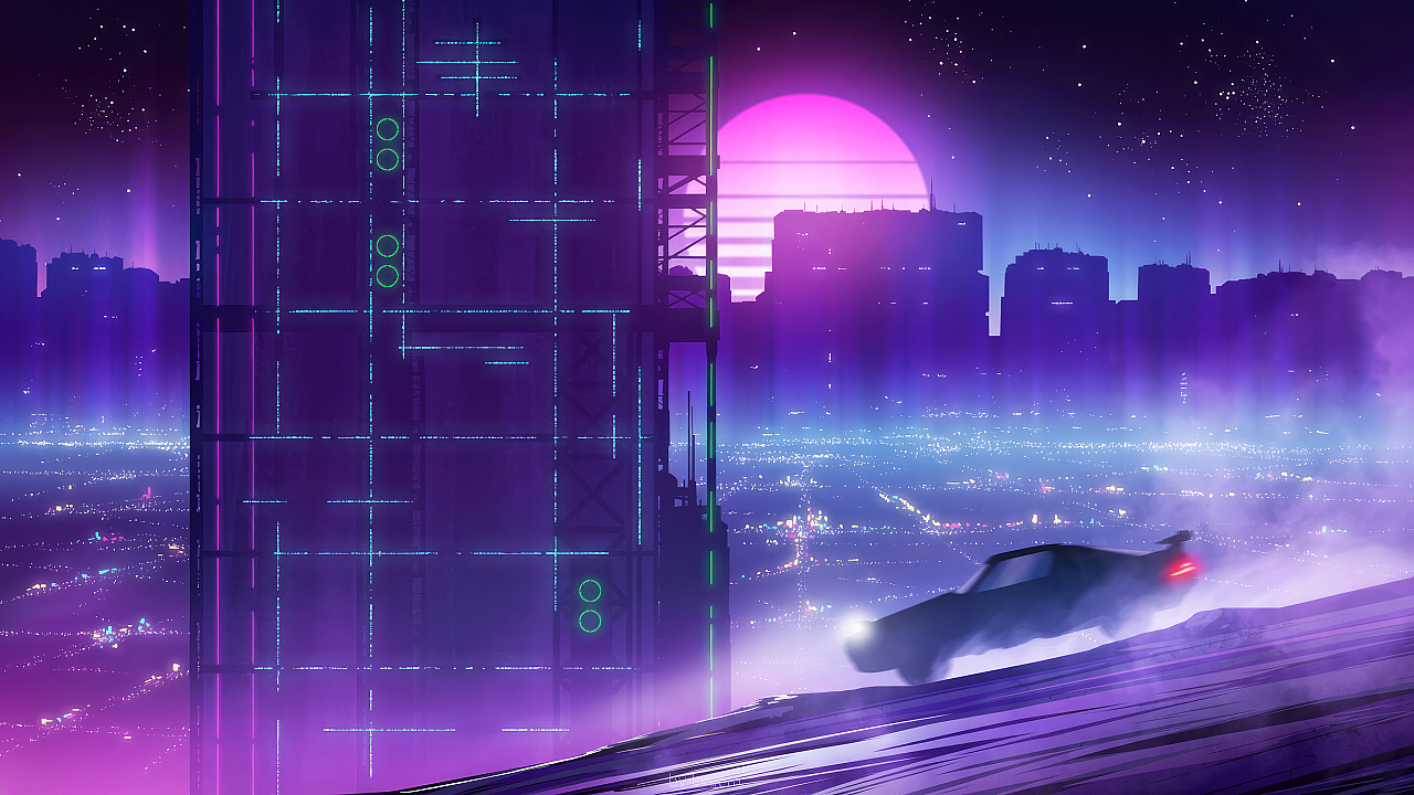 This wallpaper features a stunning depiction of a futuristic night city scene, dominated by a sleek, advanced car. The overall aesthetic is distinctly Sci-Fi, with vibrant neon lights illuminating the cityscape and showcasing the technological advancements on display. The car itself could be interpreted as a flying car or a highly advanced ground vehicle, adding to the sense of wonder and technological possibility.