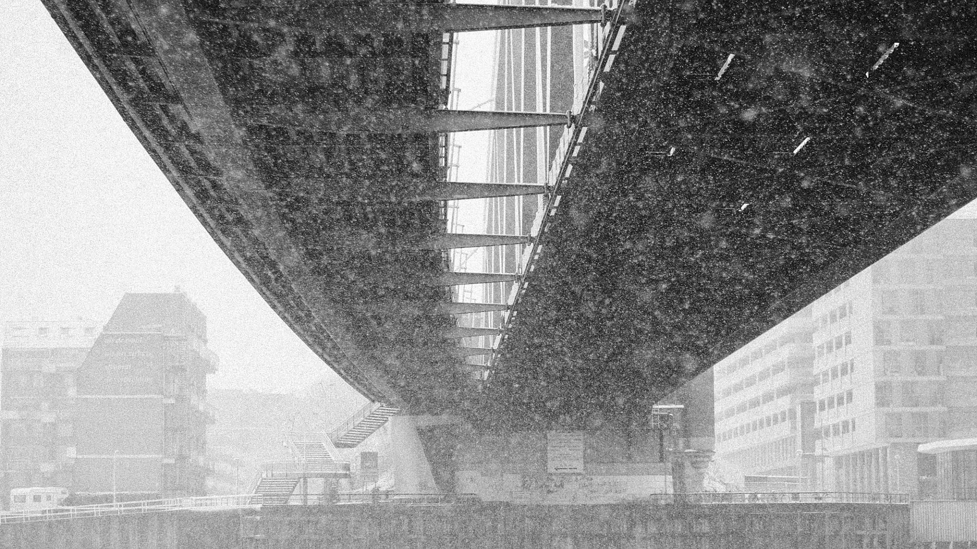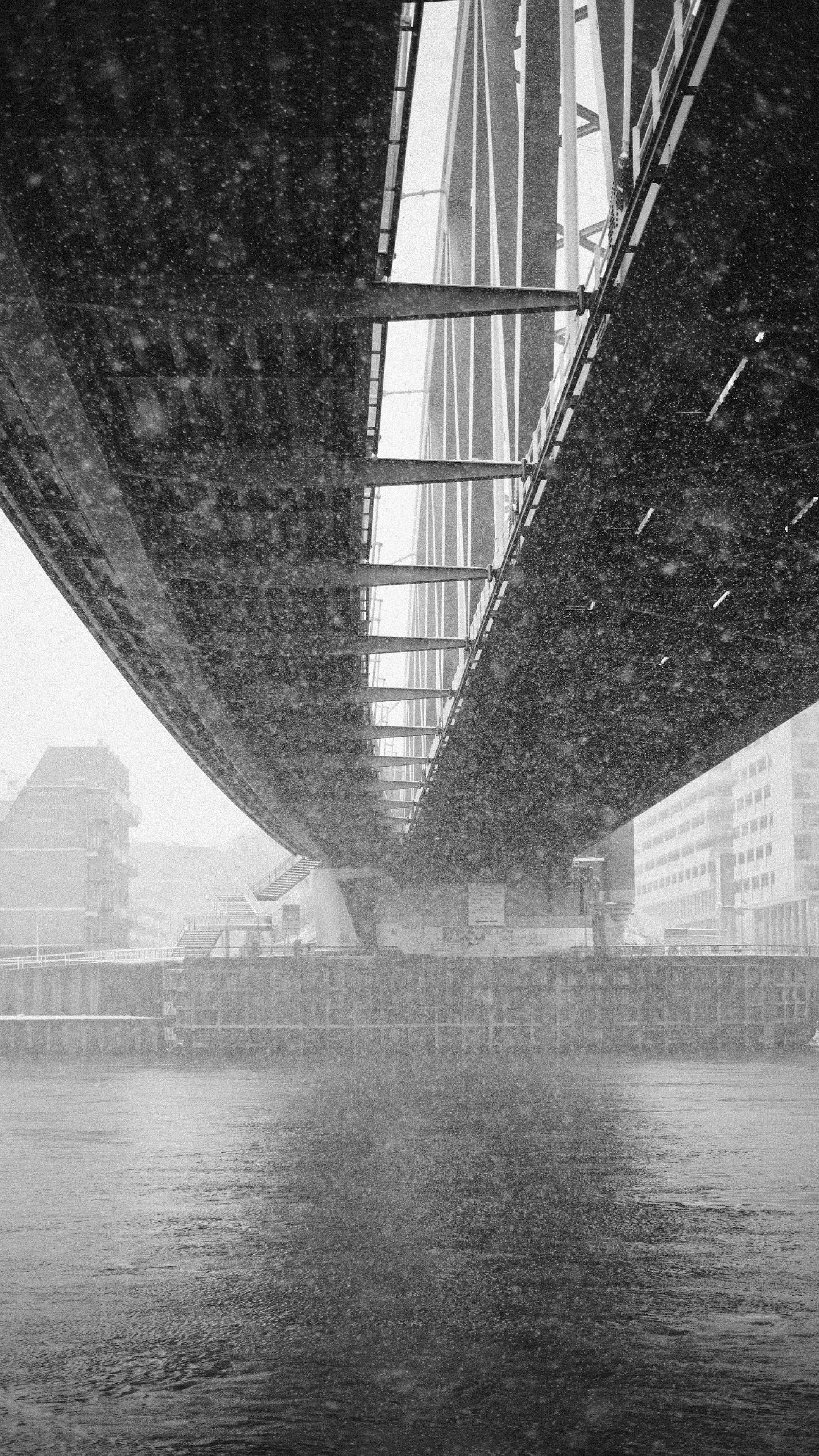 grayscale, monochrome, architectural photography, bridge, metal bridge, steel bridge, underneath, below, structure, infrastructure, urban landscape, cityscape, industrial, geometric, abstract