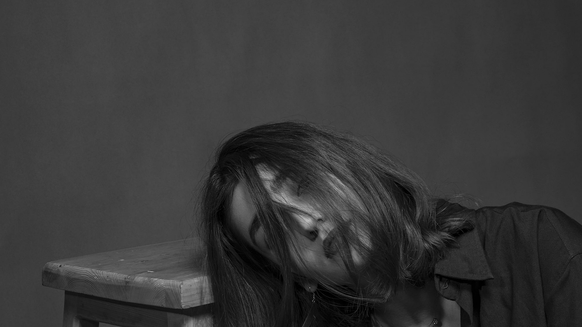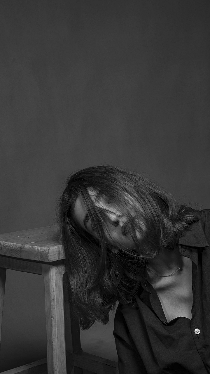 grayscale, monochrome, black and white, woman, female, chair, seat, sitting, pose, portrait, photography, photo, image, still life, minimalistic