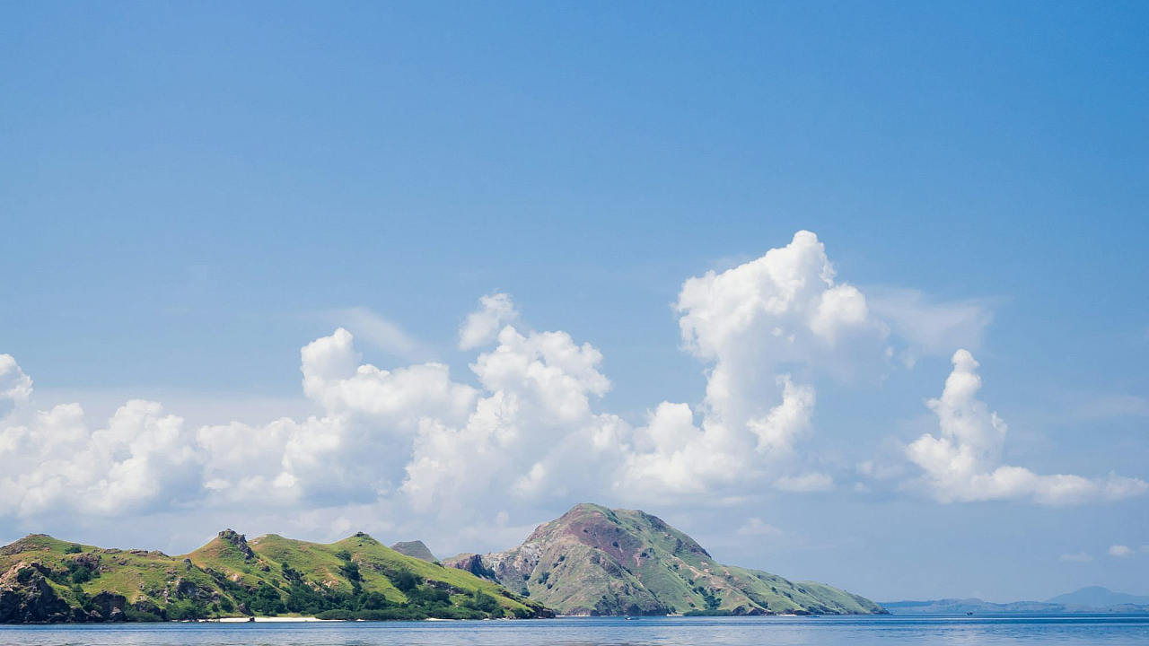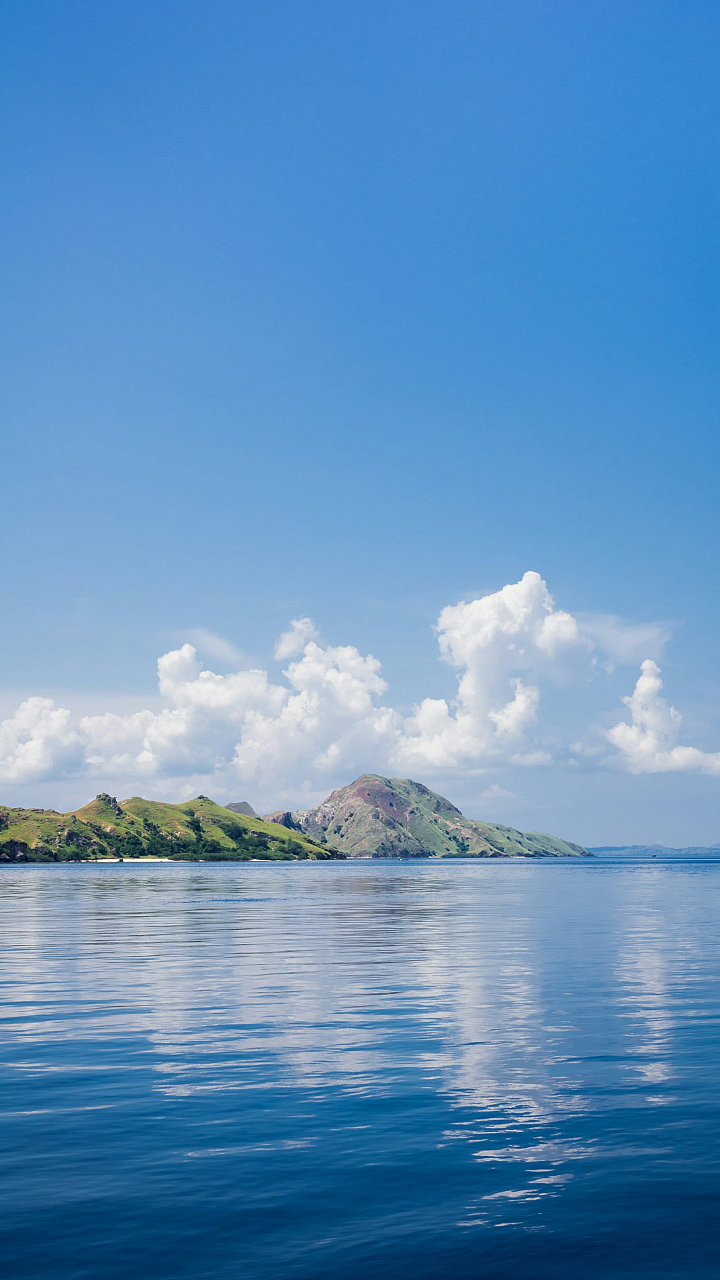 Keywords: green island, blue sea, blue sky, white clouds, daytime, ocean, island, nature, landscape, scenery, tropical, paradise, idyllic, tranquil, serenity