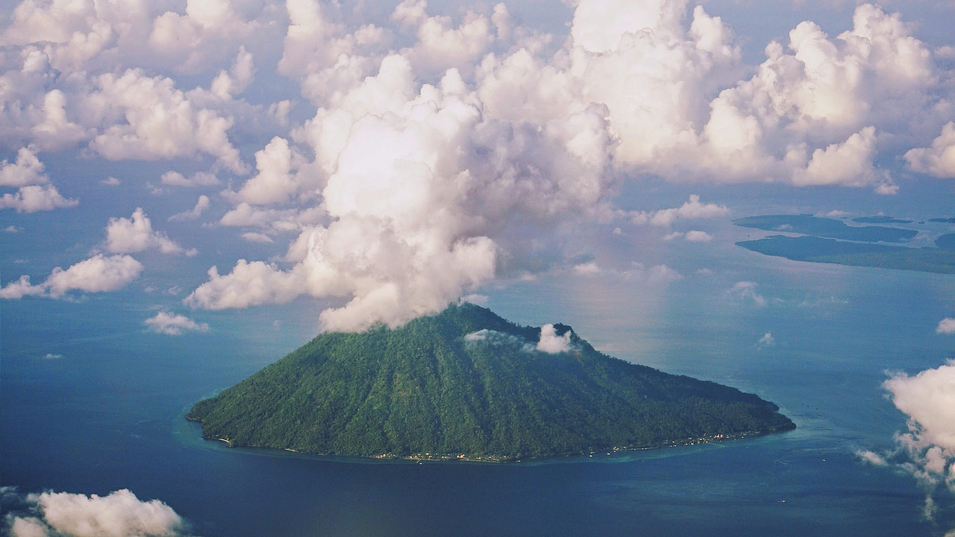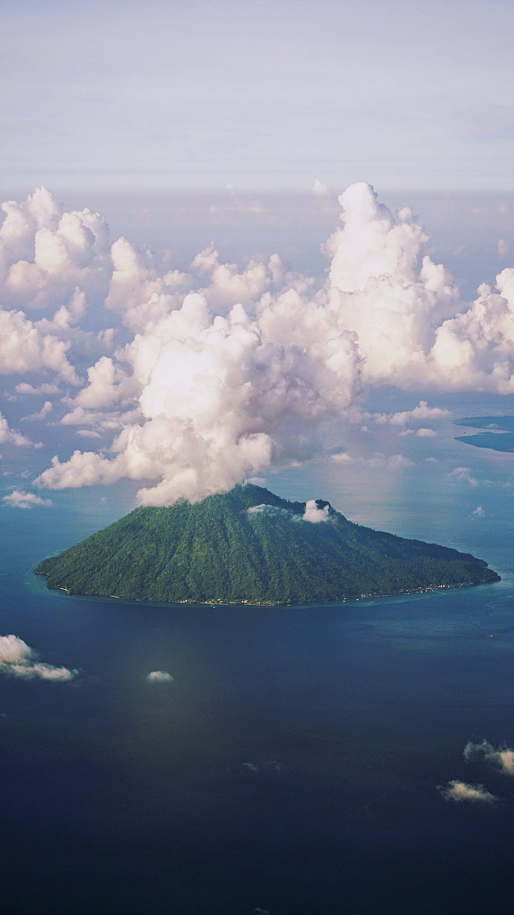 This wallpaper showcases a breathtaking view of a green mountain set against a backdrop of white clouds and a vibrant blue sky. Captured during the daytime, the image offers a stunning display of natural beauty.