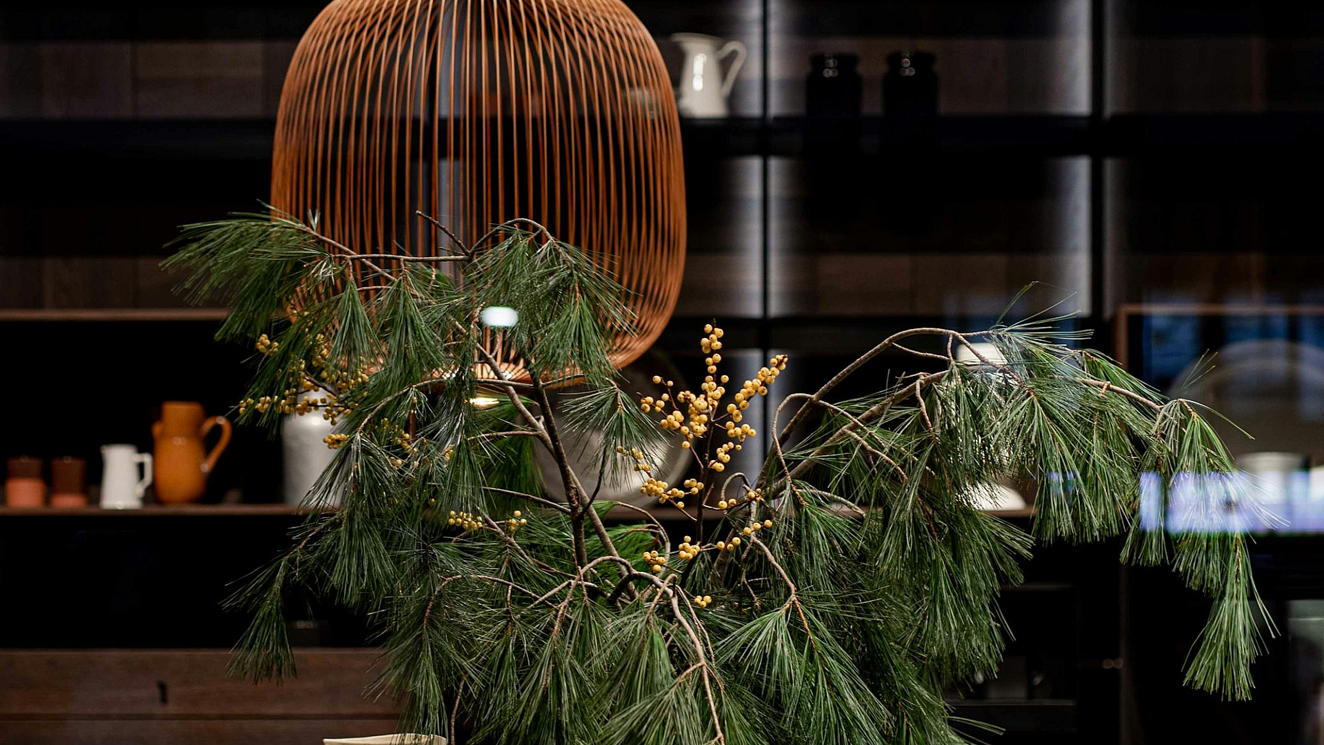 The high-quality image ensures a sharp and detailed display on any device. The foliage of the pine tree is richly detailed, offering a truly immersive experience. The subtle texture of the ceramic vase is also beautifully rendered. Consider using this wallpaper for your laptop, tablet, or smartphone for a refreshing and calming visual.