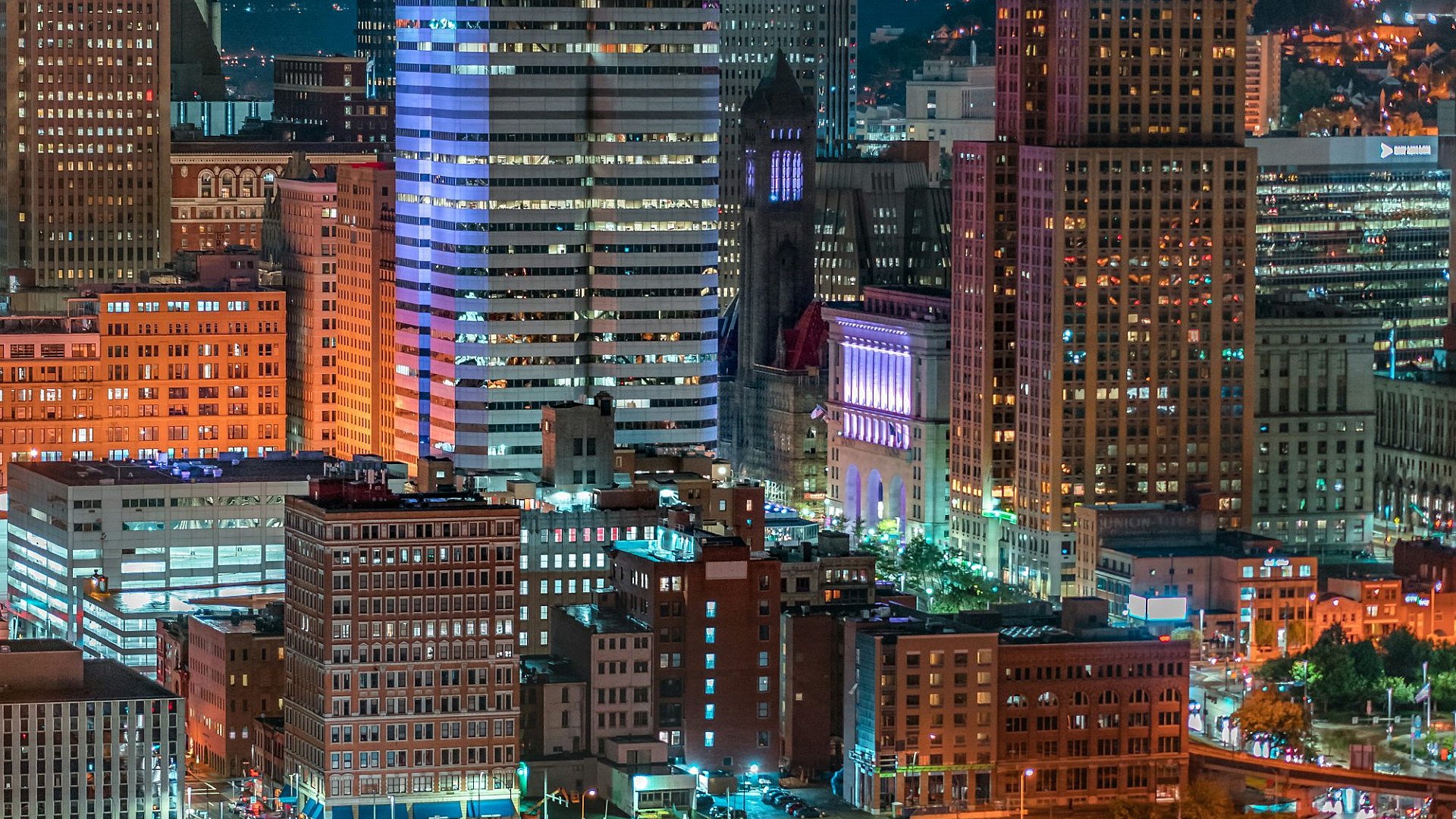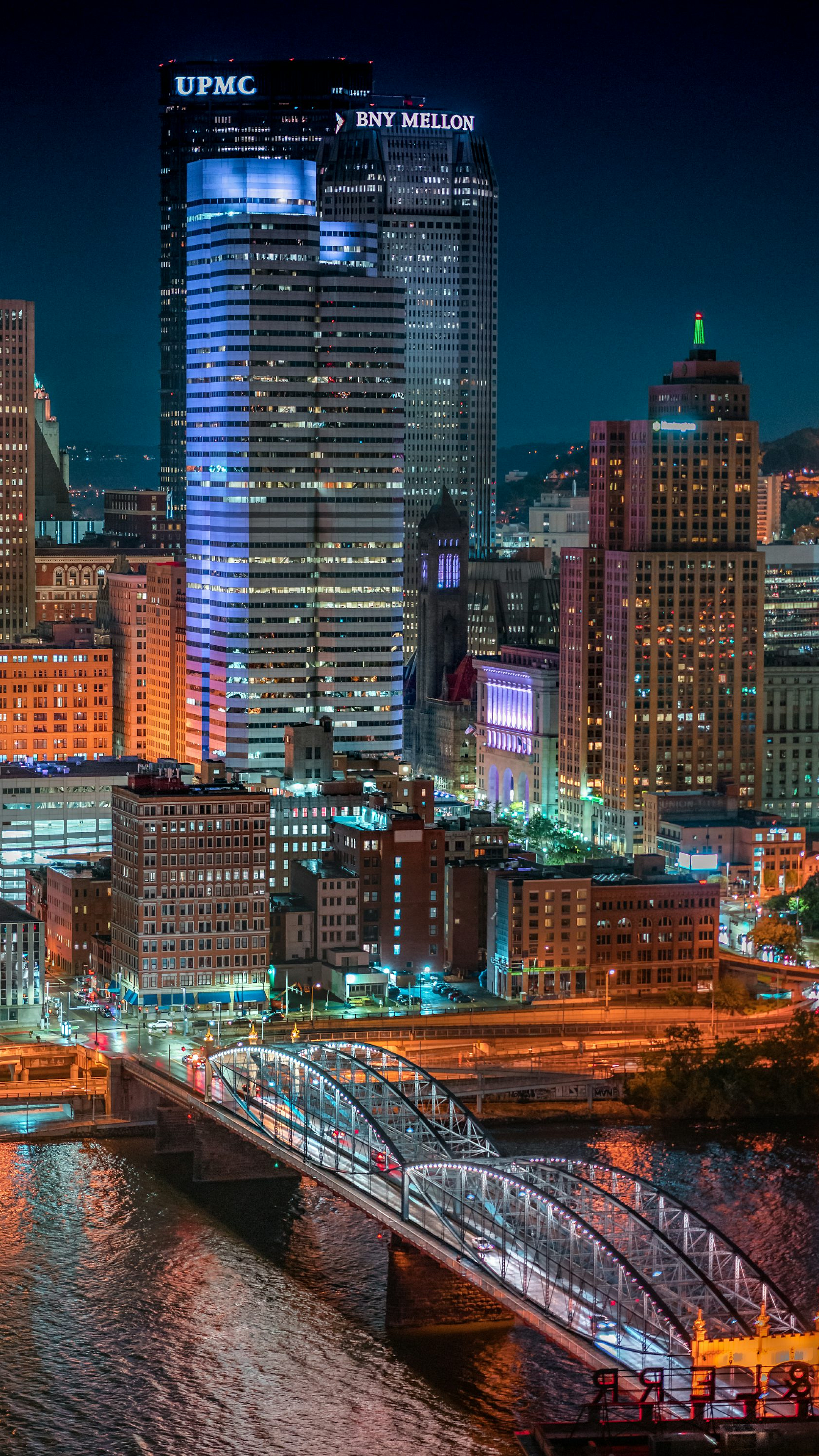 lighted building, bridge, night, cityscape, urban, architecture, structure, illuminated, lights, night scene, evening, reflection, water, skyline, city lights