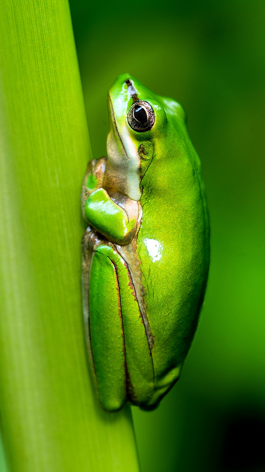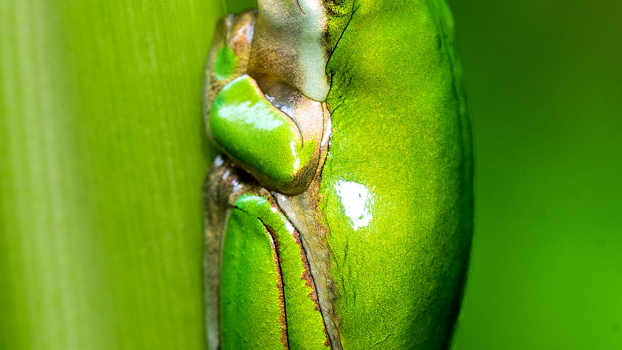 This stunning wallpaper features a breathtaking macro photo of a green frog. The image showcases incredible detail, capturing the texture of its skin and the vibrant green hue. Perfect for nature lovers and photography enthusiasts.