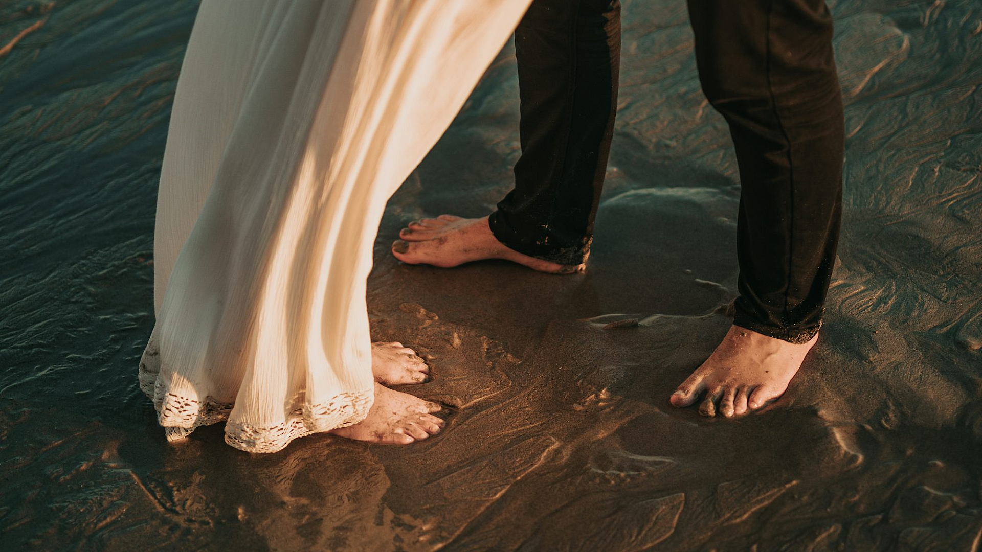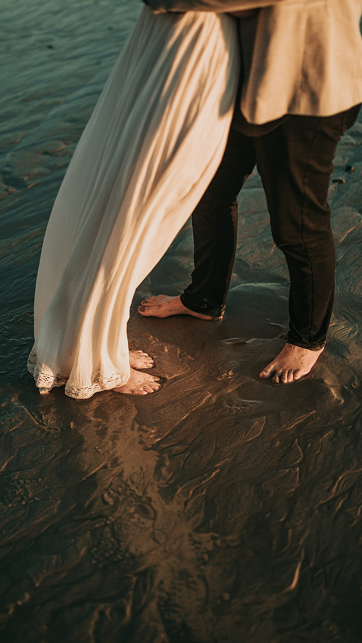 man, woman, couple, shallow water, water, ocean, sea, beach, shore, coastline, standing, together, romantic, love, landscape