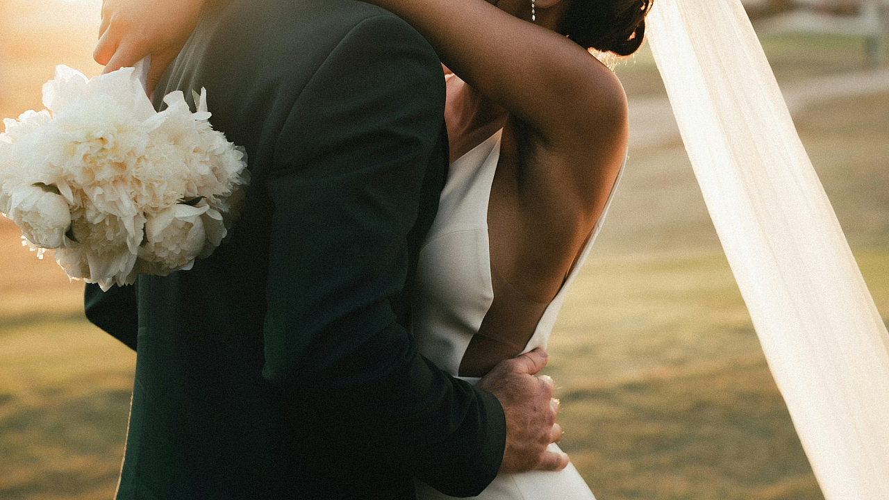 Wallpaper Man in Black Suit Kissing Woman in White Wedding Dress