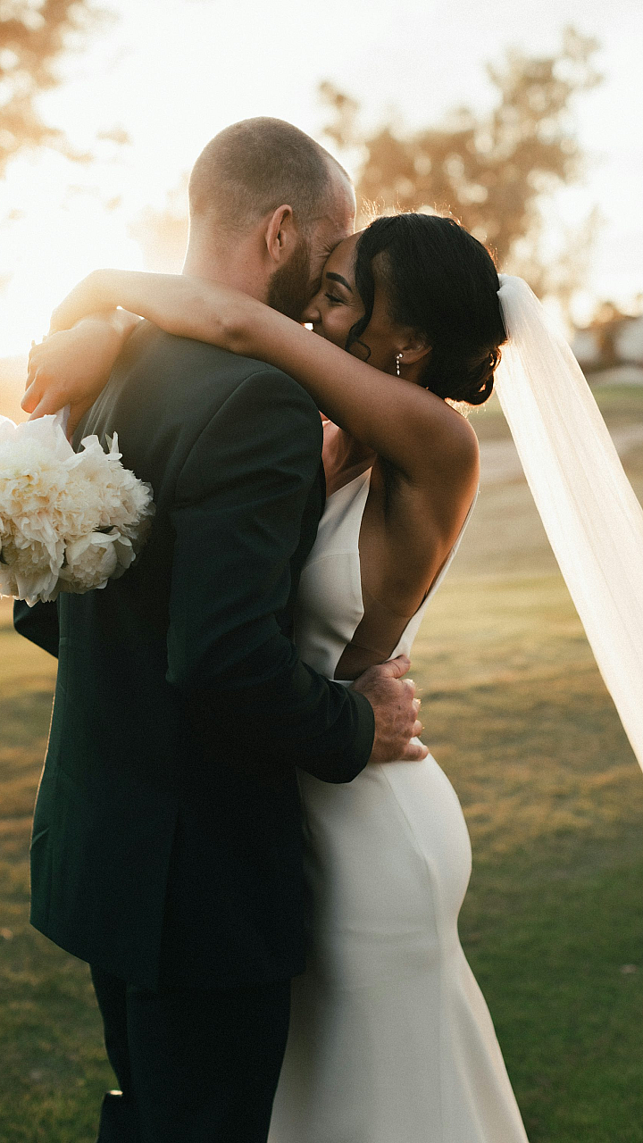 man in black suit kissing woman in white wedding dress
