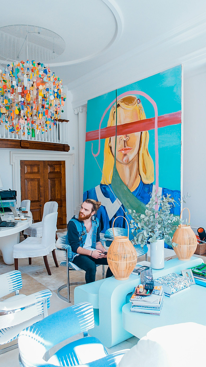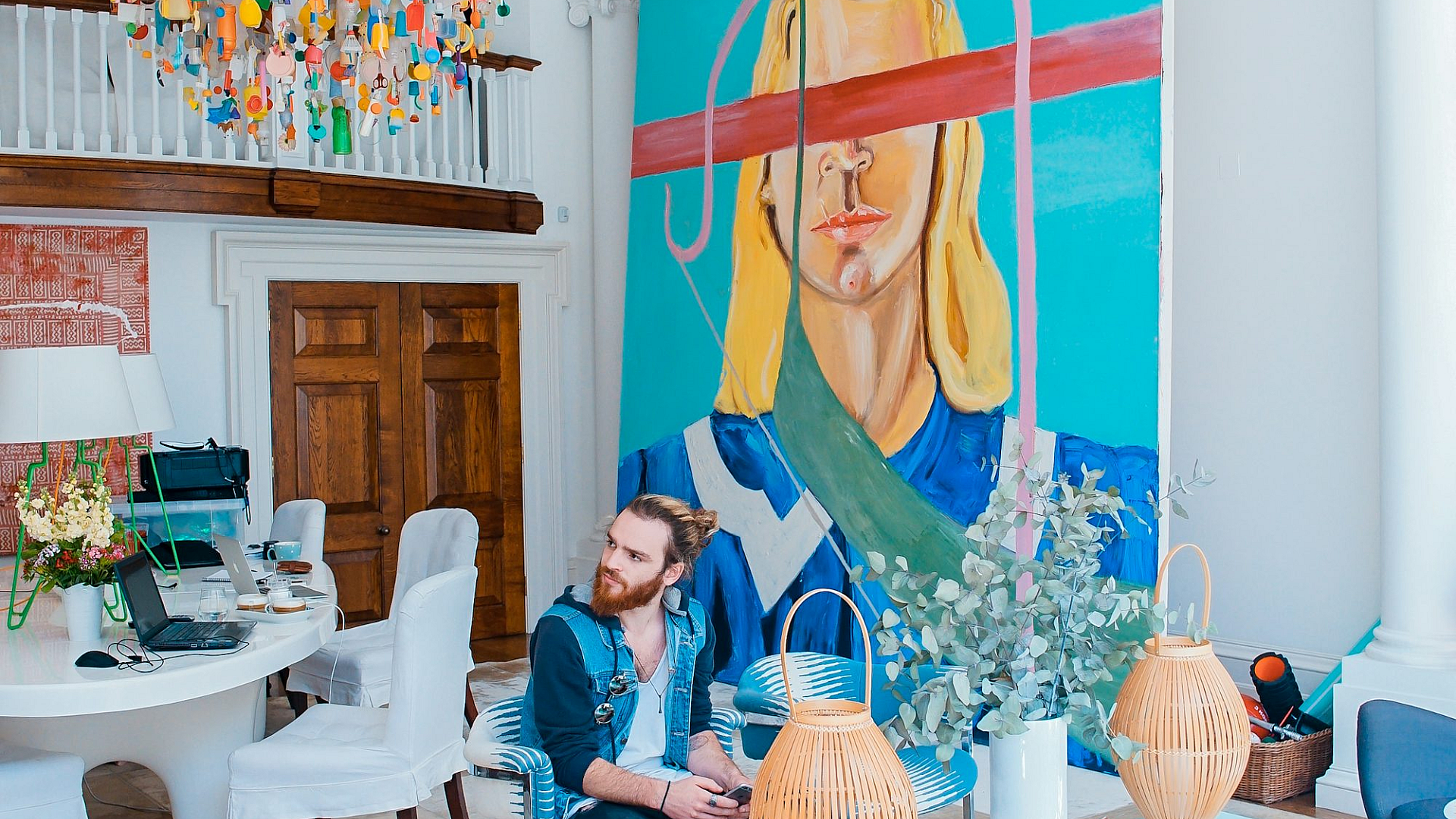 This wallpaper features a captivating scene: a man seated on a chair, positioned near a striking portrait painting of a woman. The composition creates a sense of intimacy and intrigue, inviting viewers to contemplate the relationship between the sitter and the subject of the painting. The image’s color palette and lighting contribute to its overall mood and aesthetic appeal.