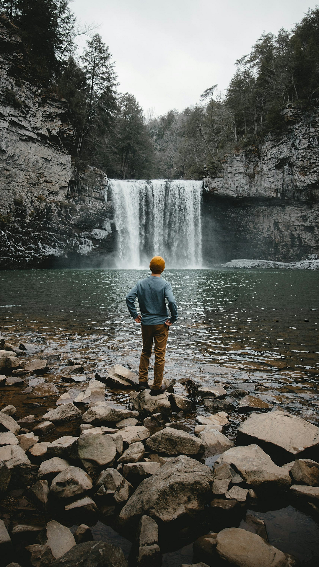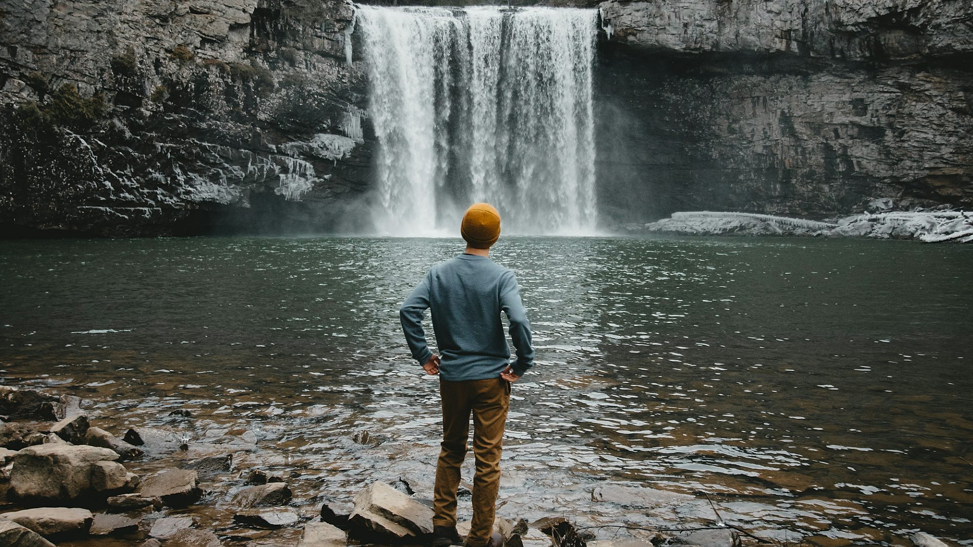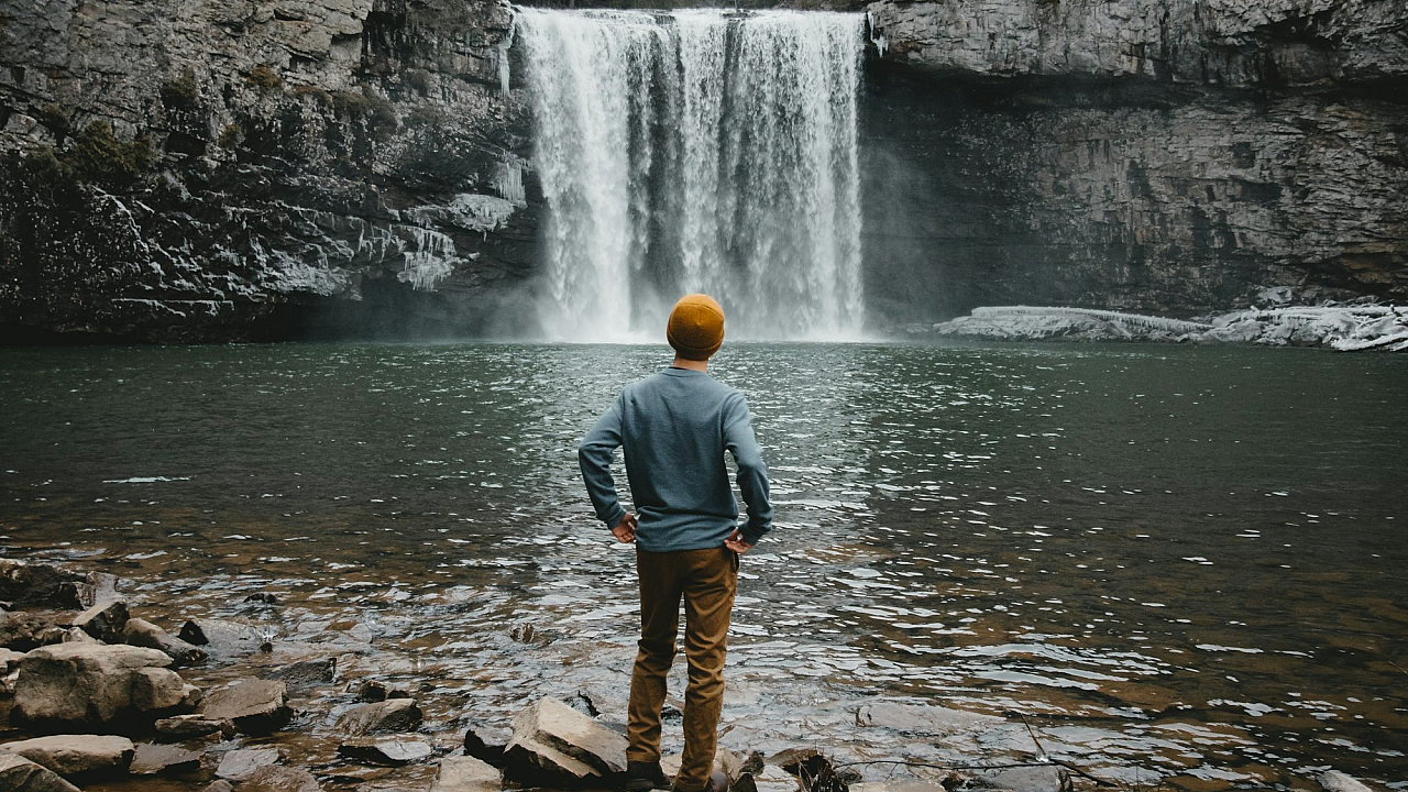 Keywords: man, standing, brown stone, waterfalls, cascade, water, nature, landscape, scenic, outdoor, majestic, powerful, serene, tranquil, cliff