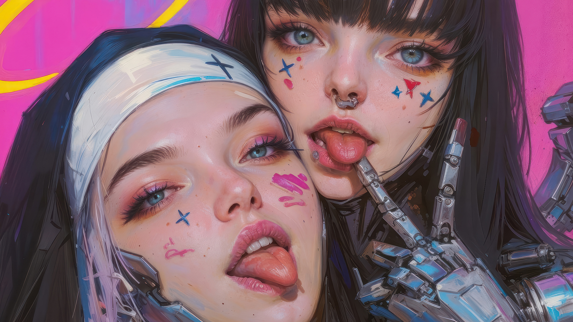 nun, anime girl, tongue out, cyberpunk, cyberpunk girl, anime, wallpaper, background, digital art, illustration, futuristic, religious, rebellious, technology, neon, sci-fi