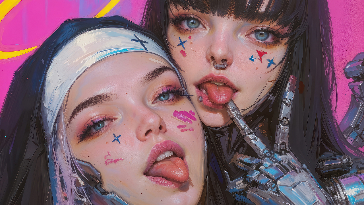 This wallpaper features a striking image of a nun, rendered in the style of anime, playfully sticking her tongue out. The overall aesthetic is firmly rooted in the cyberpunk genre, showcasing a blend of futuristic technology and religious imagery. The vibrant colors and detailed artwork make this a perfect choice for desktops, mobile devices, or any digital display.