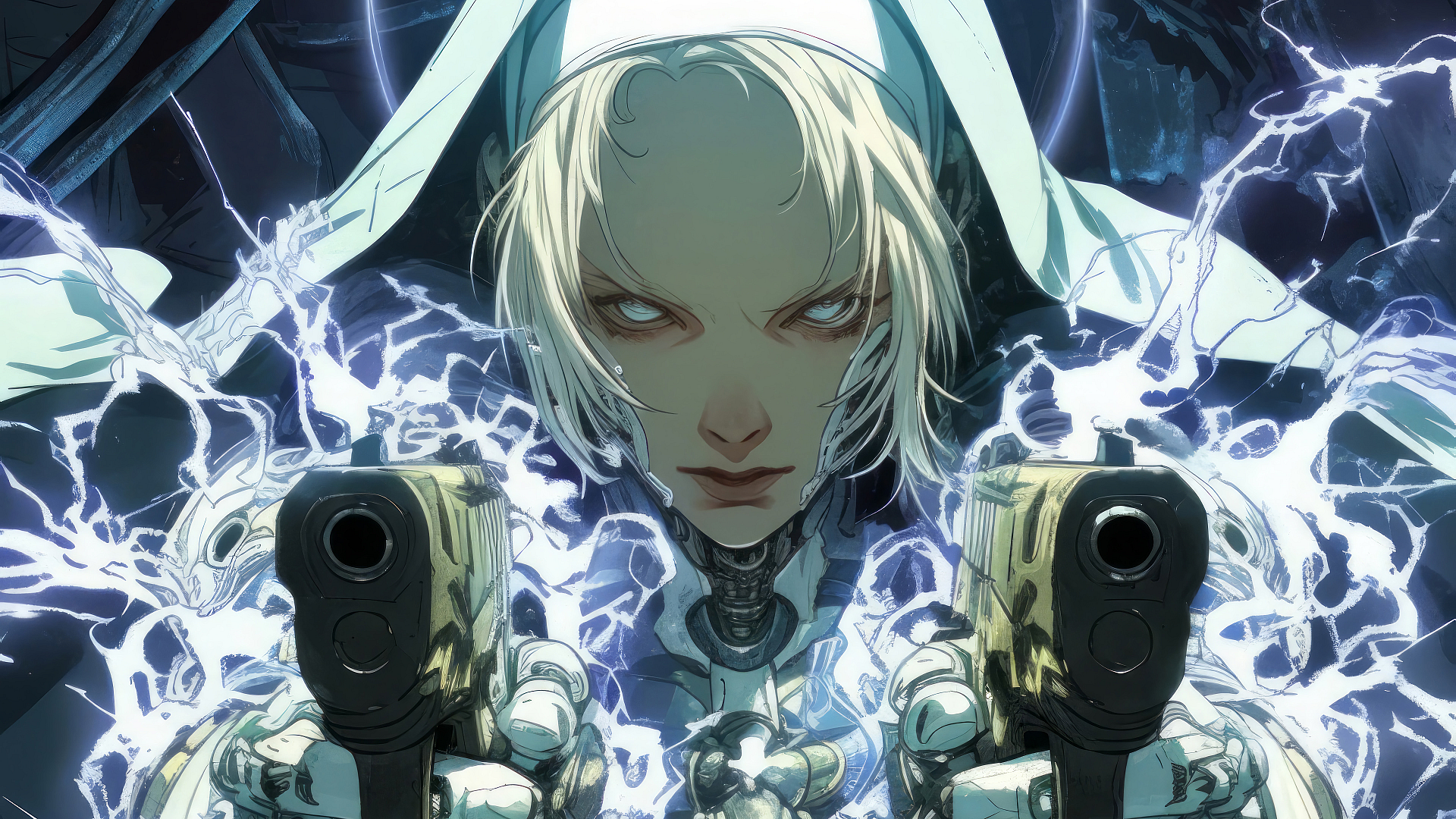This wallpaper features a captivating depiction of a nun, unexpectedly armed with guns, in a sci-fi setting. The anime style girl is a striking blend of religious imagery and futuristic weaponry. Her attire and pose are designed to convey a sense of both piety and combat readiness, making for a visually compelling and intriguing image. The overall aesthetic is a fusion of the sacred and the secular, the peaceful and the powerful.