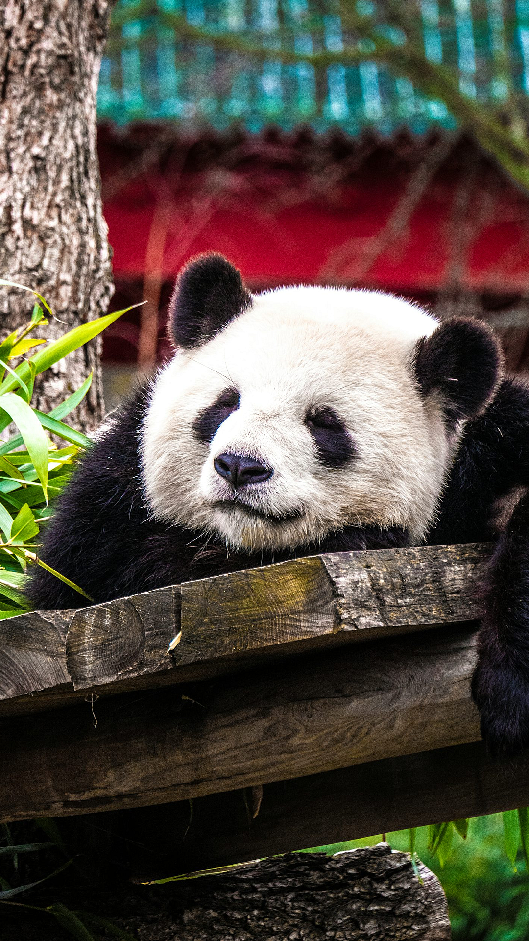 This wallpaper features a charming panda bear resting on a gray plank, with lush green plant foliage in the background. The image offers a serene and peaceful atmosphere, perfect for a desktop or mobile background. The contrast between the panda’s black and white fur and the grey wood creates a visually appealing composition.