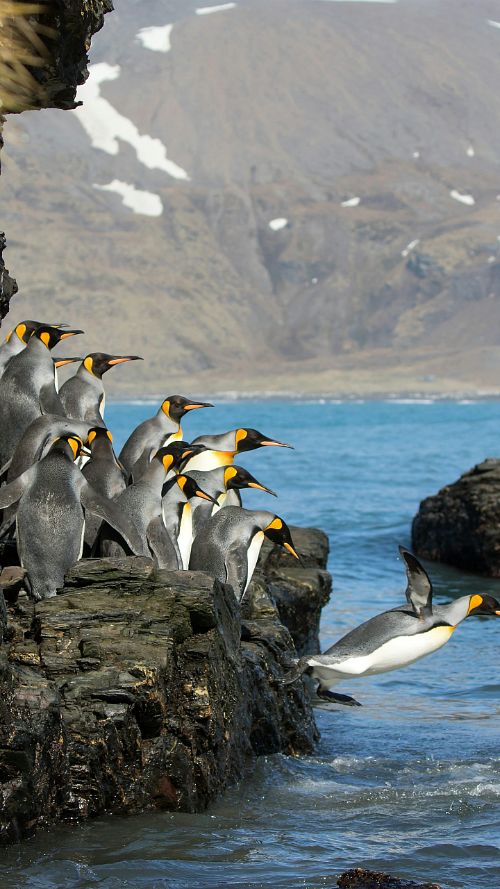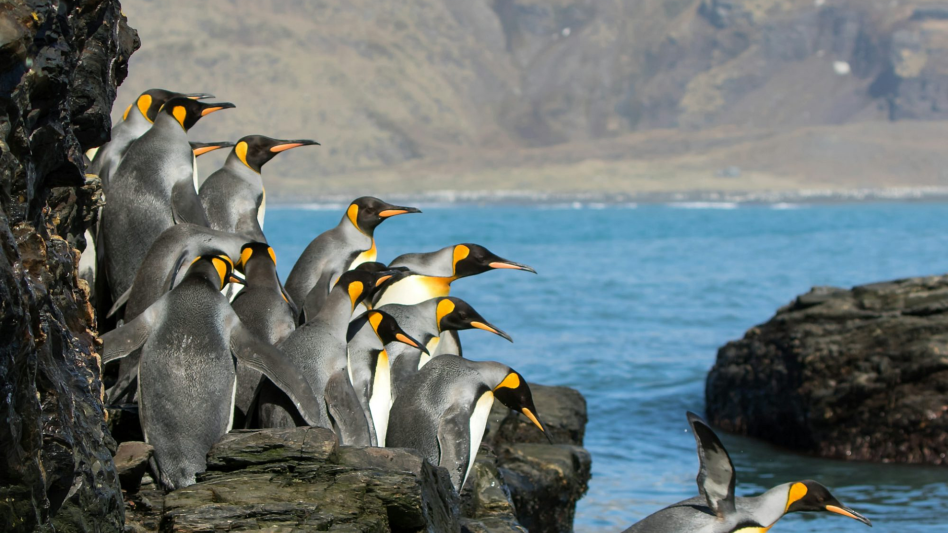 penguin, penguins, rock formation, rocks, stones, cliff, antarctica, wildlife, animal, birds, ocean, sea, ice, nature, landscape