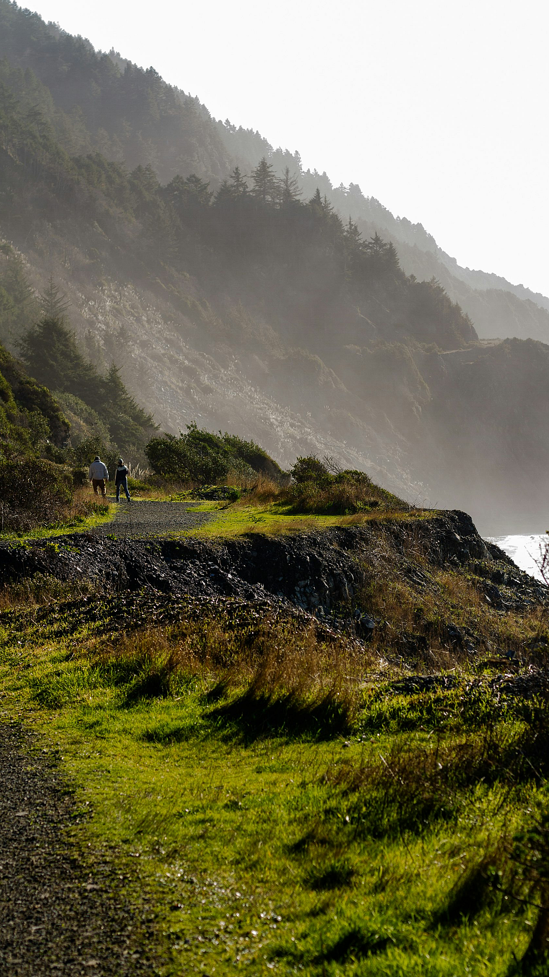 The vibrant green of the grass contrasts beautifully with the soft, muted tones of the fog. The people, small in scale, contribute to the sense of vastness and tranquility of the landscape. It evokes a feeling of peace and quietude, ideal for a relaxing and contemplative mood.