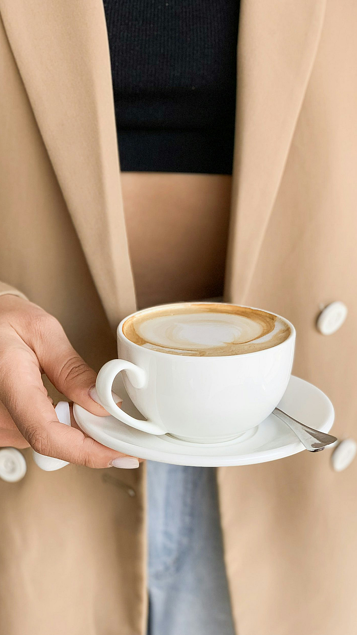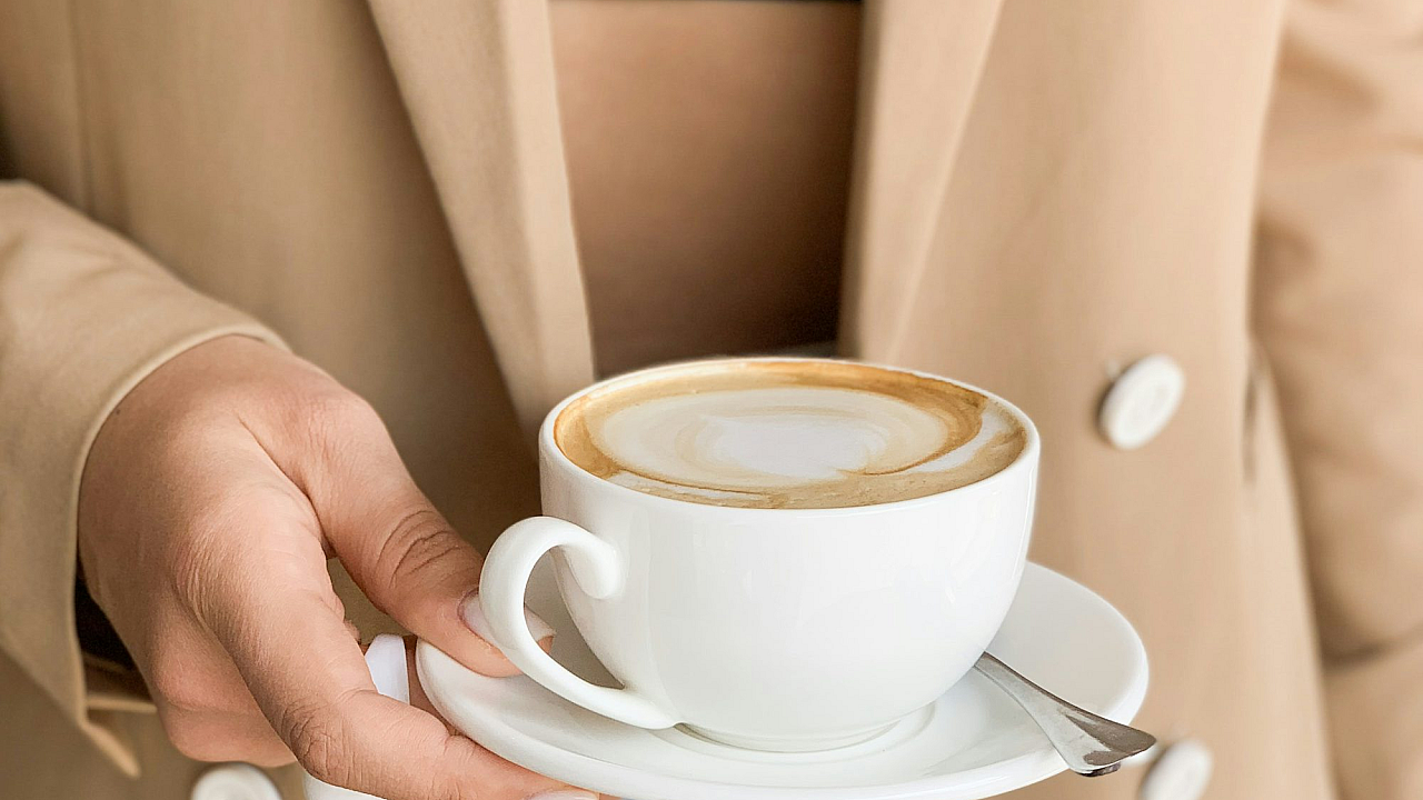The white ceramic cup provides a clean and elegant contrast to the rich brown of the coffee, while the hand holding the cup adds a personal and intimate touch to the image. The overall aesthetic is calming and inviting, making it an ideal wallpaper for those seeking a serene and peaceful backdrop for their screens.