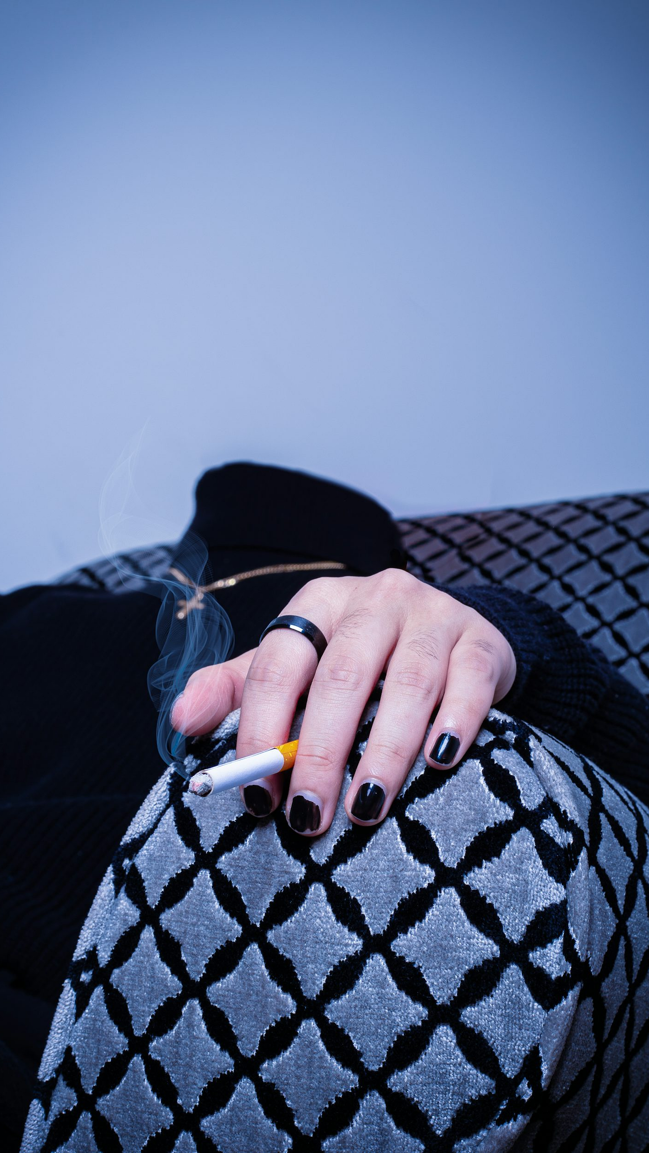 person, black and white shirt, orange pen, white pen, holding, writing instrument, pen, stationary, black shirt, white shirt, b&w, monochrome, portrait, closeup, hand
