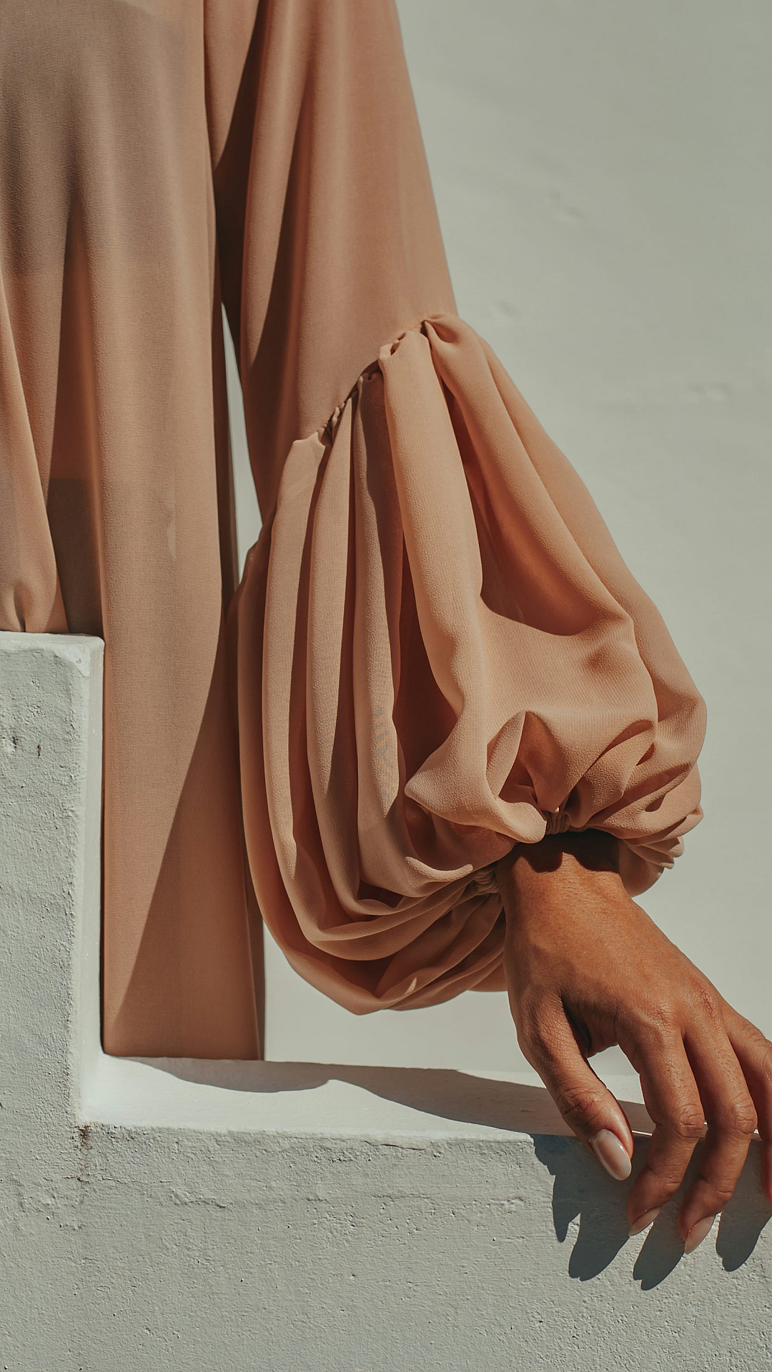 The image is perfect for those who appreciate minimalist fashion photography. The long sleeve shirt adds a touch of casual elegance, suitable for both desktop and mobile devices. The neutral color palette makes it adaptable to numerous screen themes and personal preferences. The overall style is understated yet visually engaging.