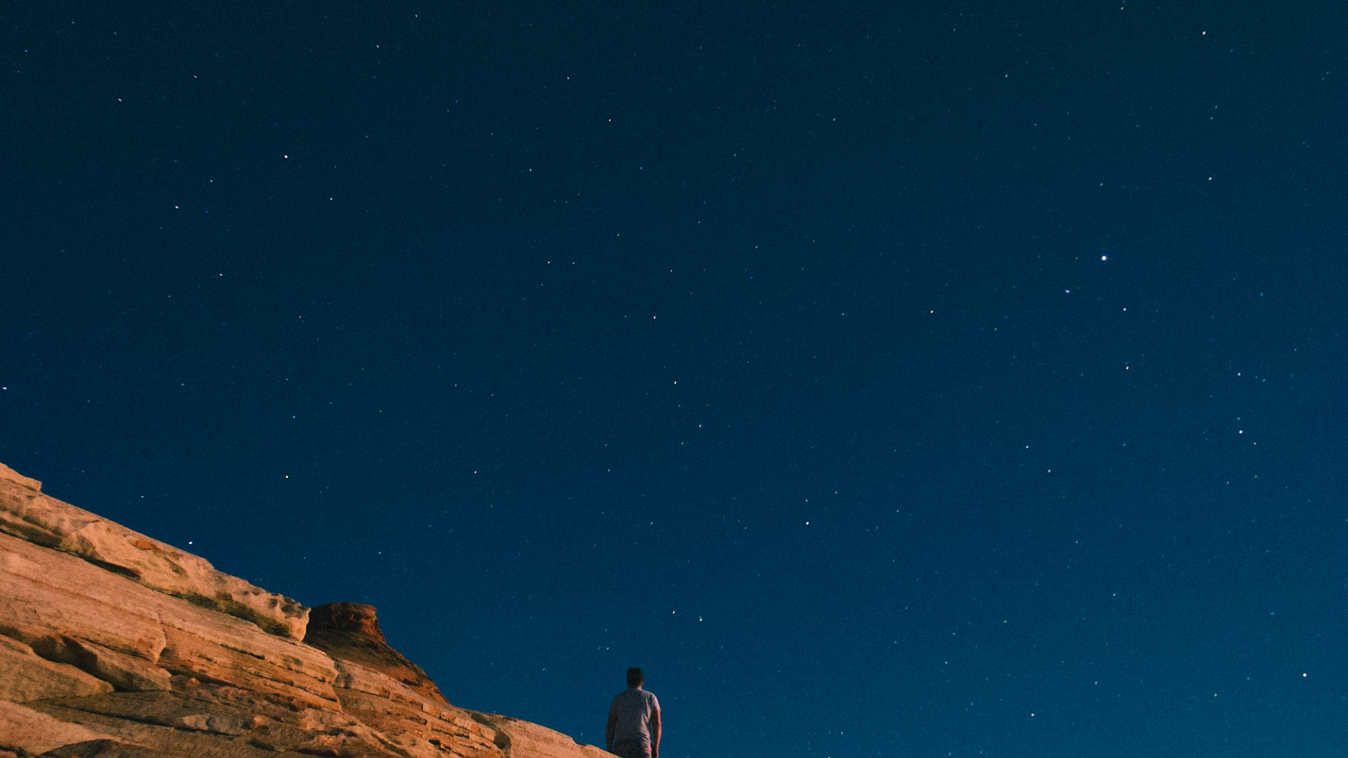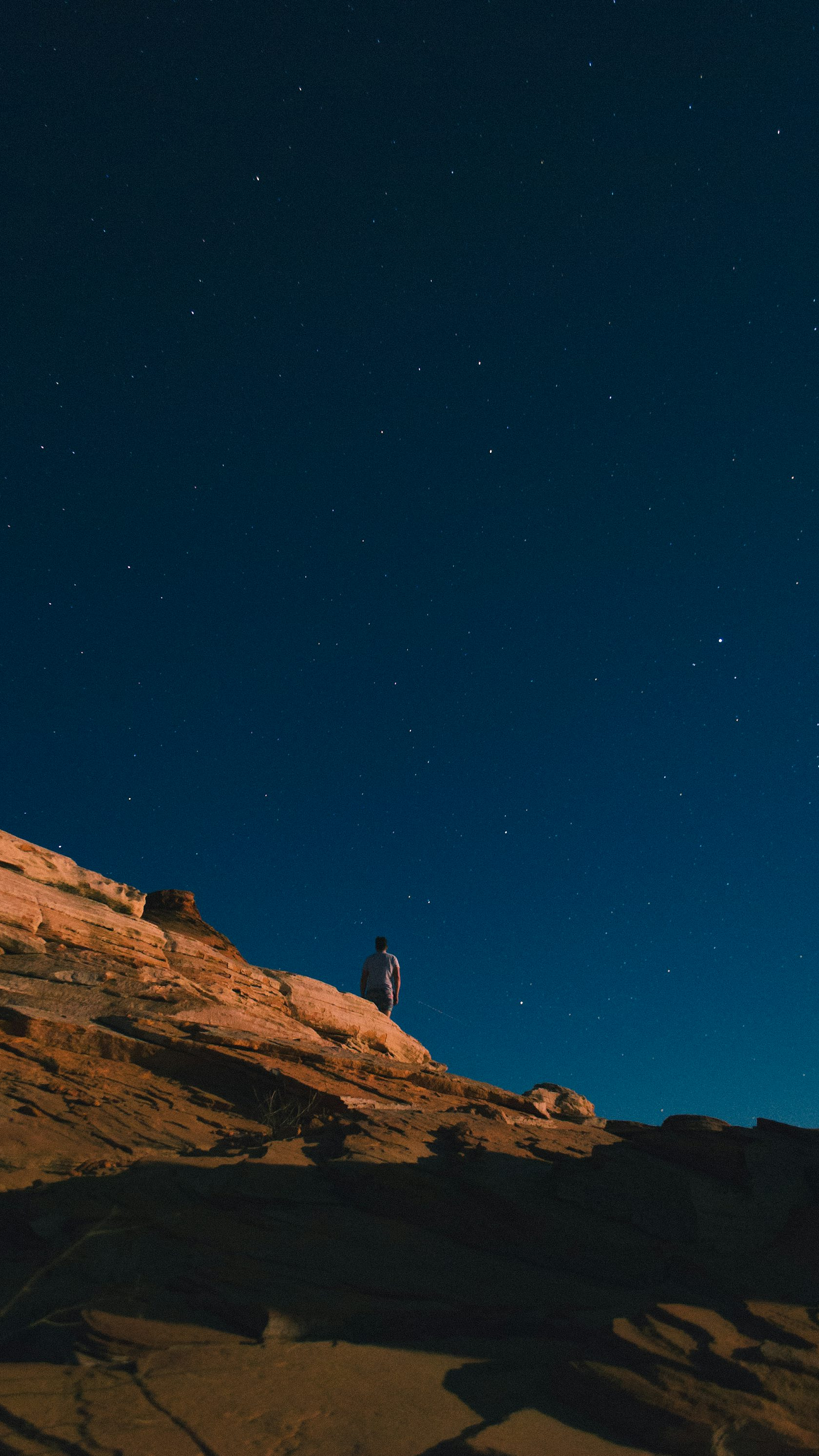person, gray shirt, rock, standing, outdoor, nature, landscape, man, male, cliff, stone, boulder, mountain, elevation, scenic