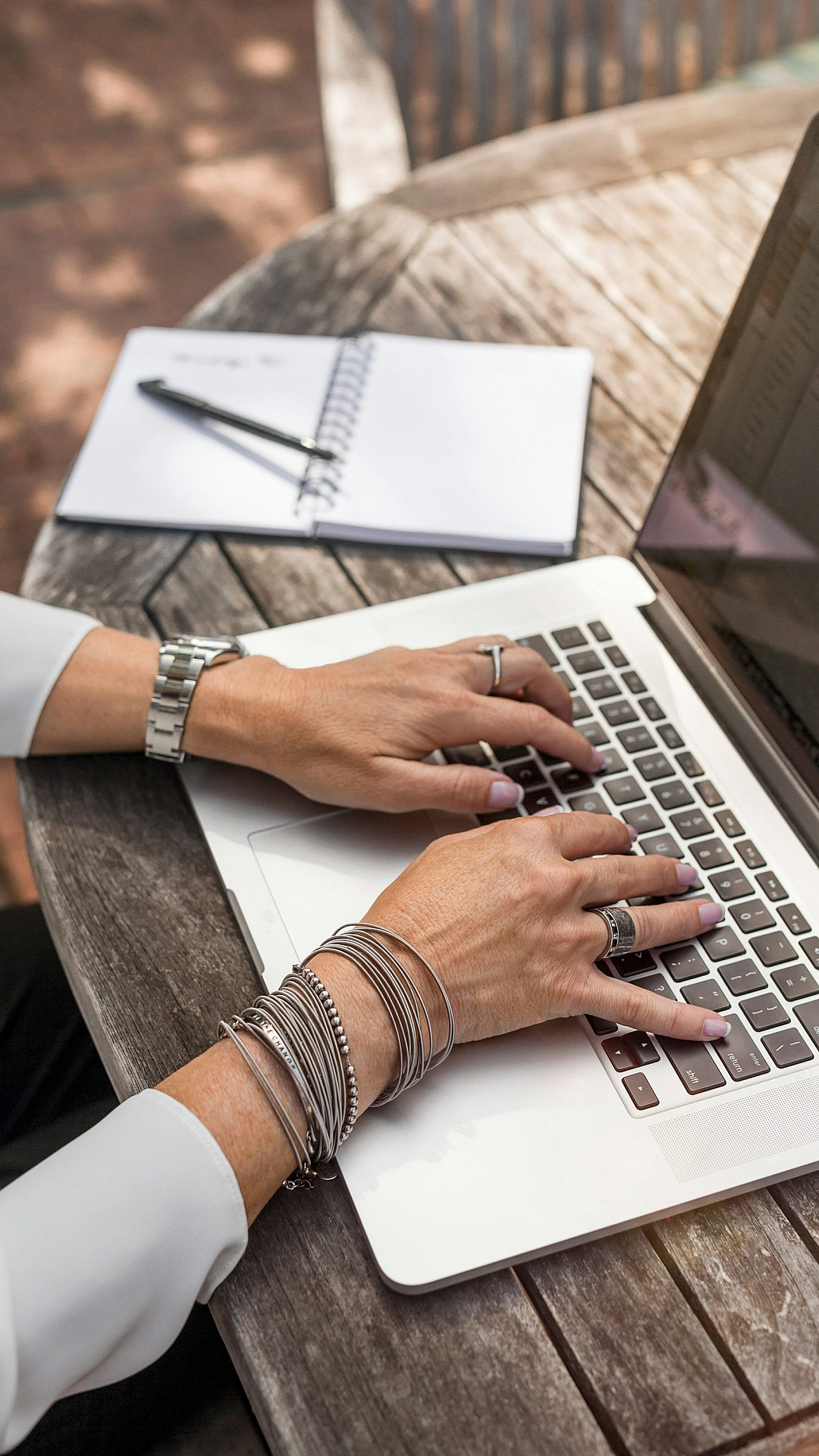 MacBook Pro, typing, laptop, notebook, wooden table, desk, work, office, daytime, sunlight, productivity, technology, computer, writing, working