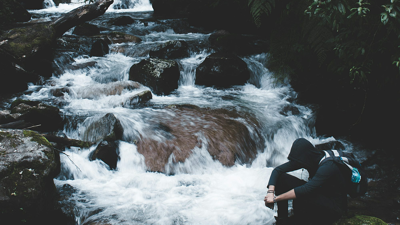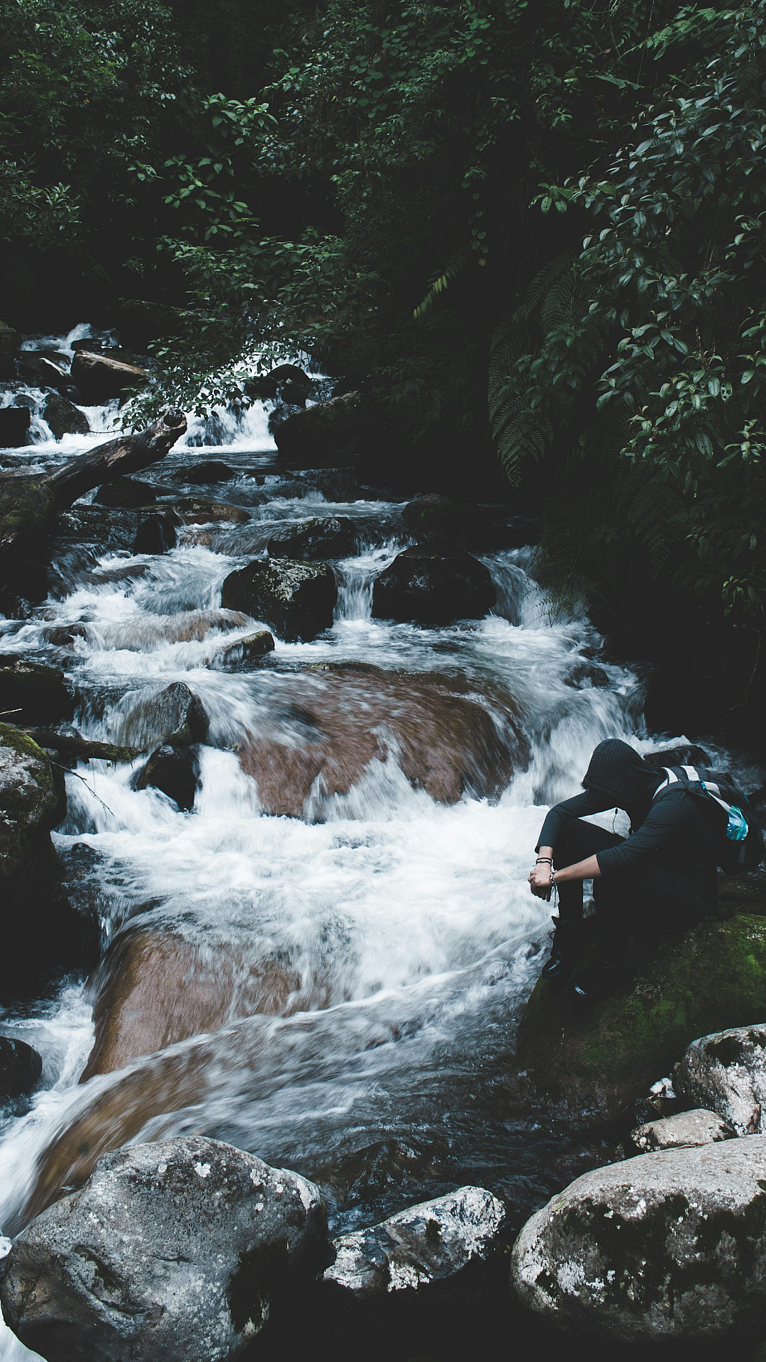 Keywords: person, hoodie, black hoodie, waterfall, water, nature, landscape, sitting, serene, peaceful, calm, relaxing, outdoor, dark clothing, scenery