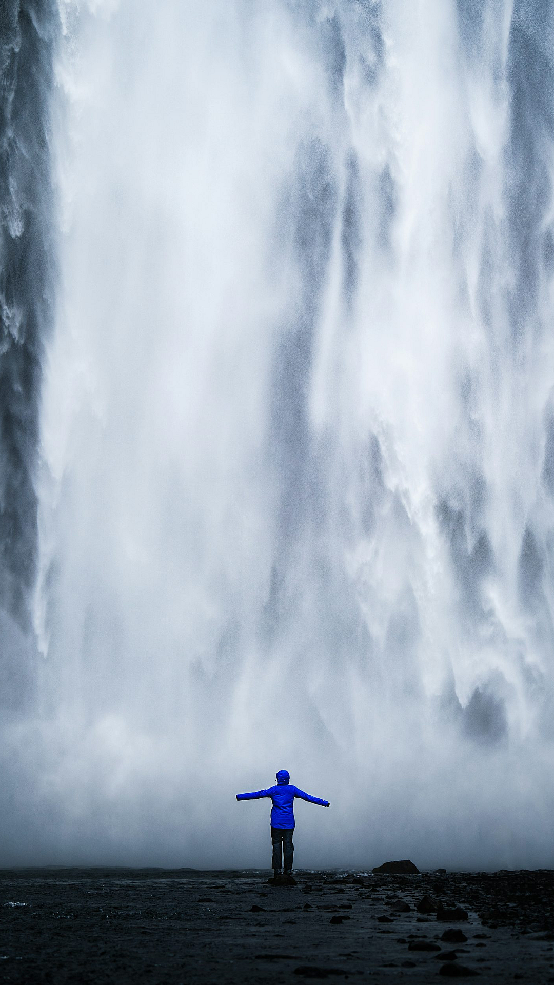 This stunning wallpaper showcases a captivating image of a person wearing a vibrant blue jacket, standing majestically in front of a breathtaking waterfall. The powerful water cascading down creates a mesmerizing backdrop, emphasizing the tranquility and awe-inspiring beauty of nature. The image is perfect for those seeking a serene and inspiring desktop or mobile background. The composition cleverly balances the human element with the overwhelming force of the waterfalls, offering a unique blend of human presence and natural splendor. The blue of the jacket provides a striking contrast to the greens and whites of the waterfall and surrounding landscape. This high-resolution image is ideal for a wide range of devices, offering vibrant colors and sharp detail. The photography is excellent, capturing the essence of the moment and the power of nature.