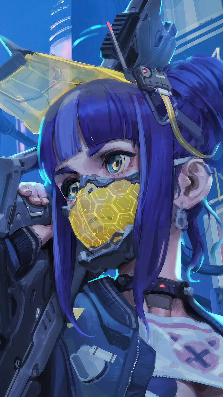 This wallpaper features a striking sci-fi anime girl, her face partially obscured by a mysterious mask, wielding a powerful-looking gun. The overall aesthetic is a blend of cyberpunk and fantasy elements, creating a visually captivating image.