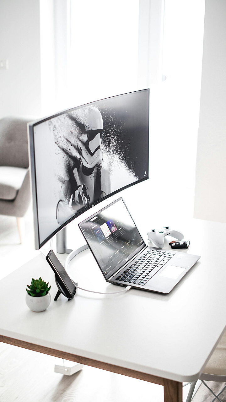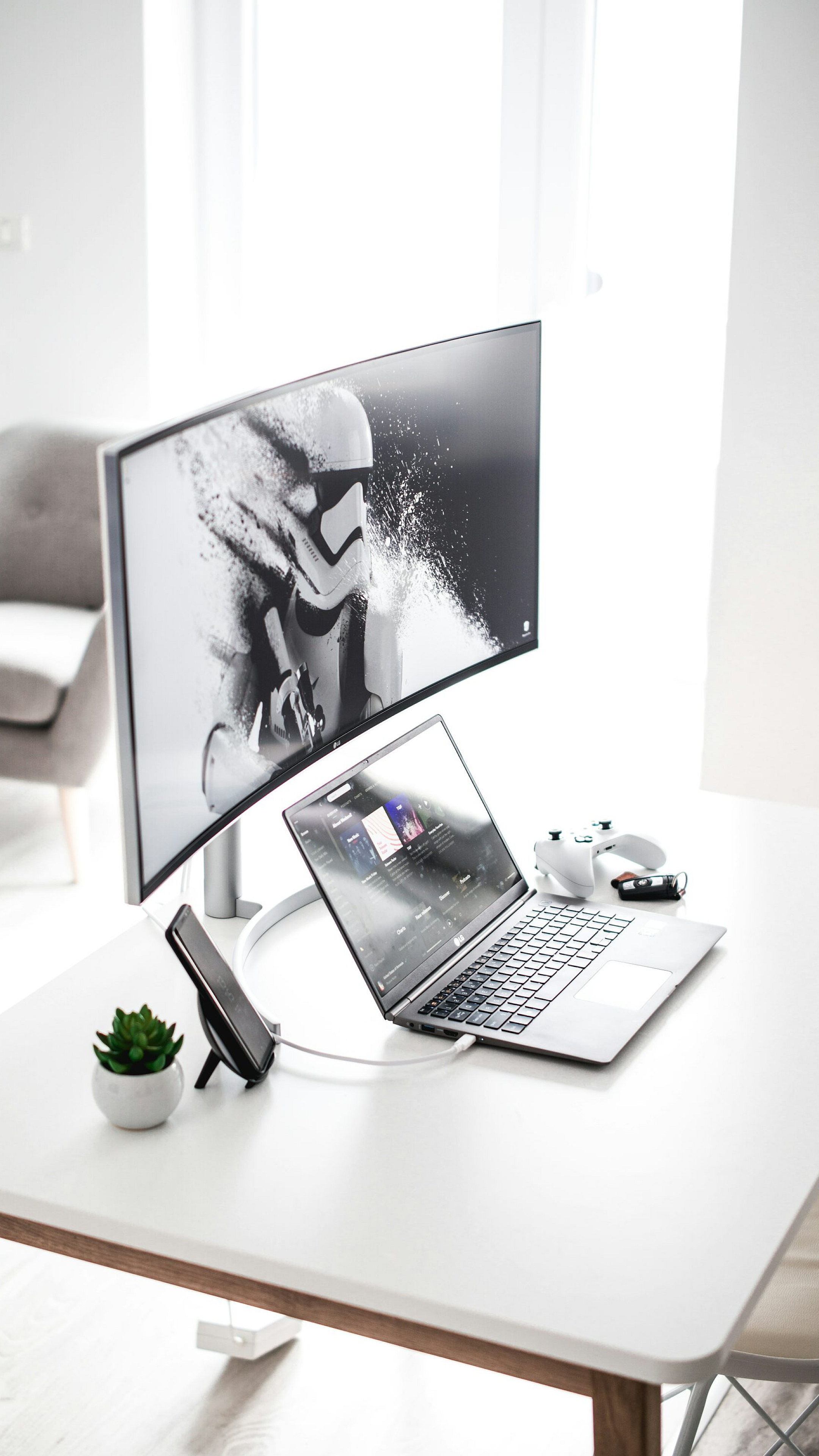 silver laptop, laptop wallpaper, table wallpaper, technology wallpaper, computer wallpaper, desk wallpaper, workstation wallpaper, office wallpaper, modern wallpaper, minimalist wallpaper, metallic laptop, silver macbook, notebook wallpaper, grey laptop, work from home wallpaper