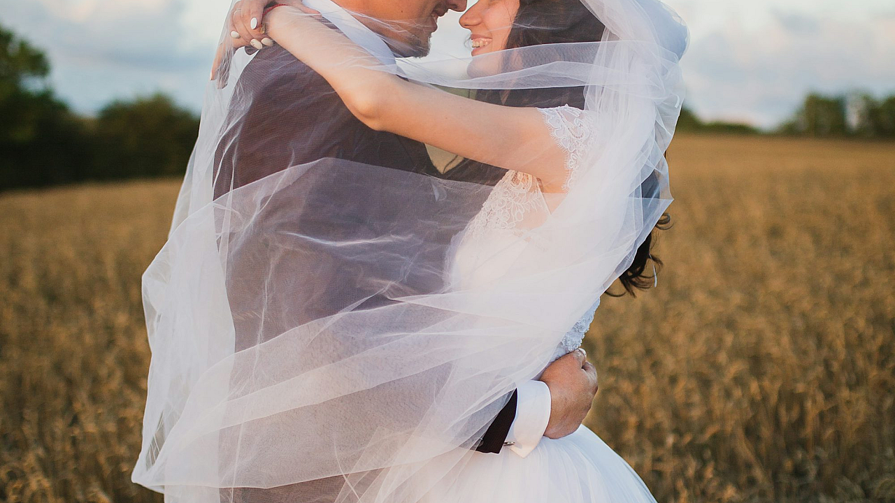 Keywords: smiling couple, newlyweds, kissing, green field, meadow, grass, nature, love, romance, wedding, marriage, happy, joyful, affection, embrace, kiss