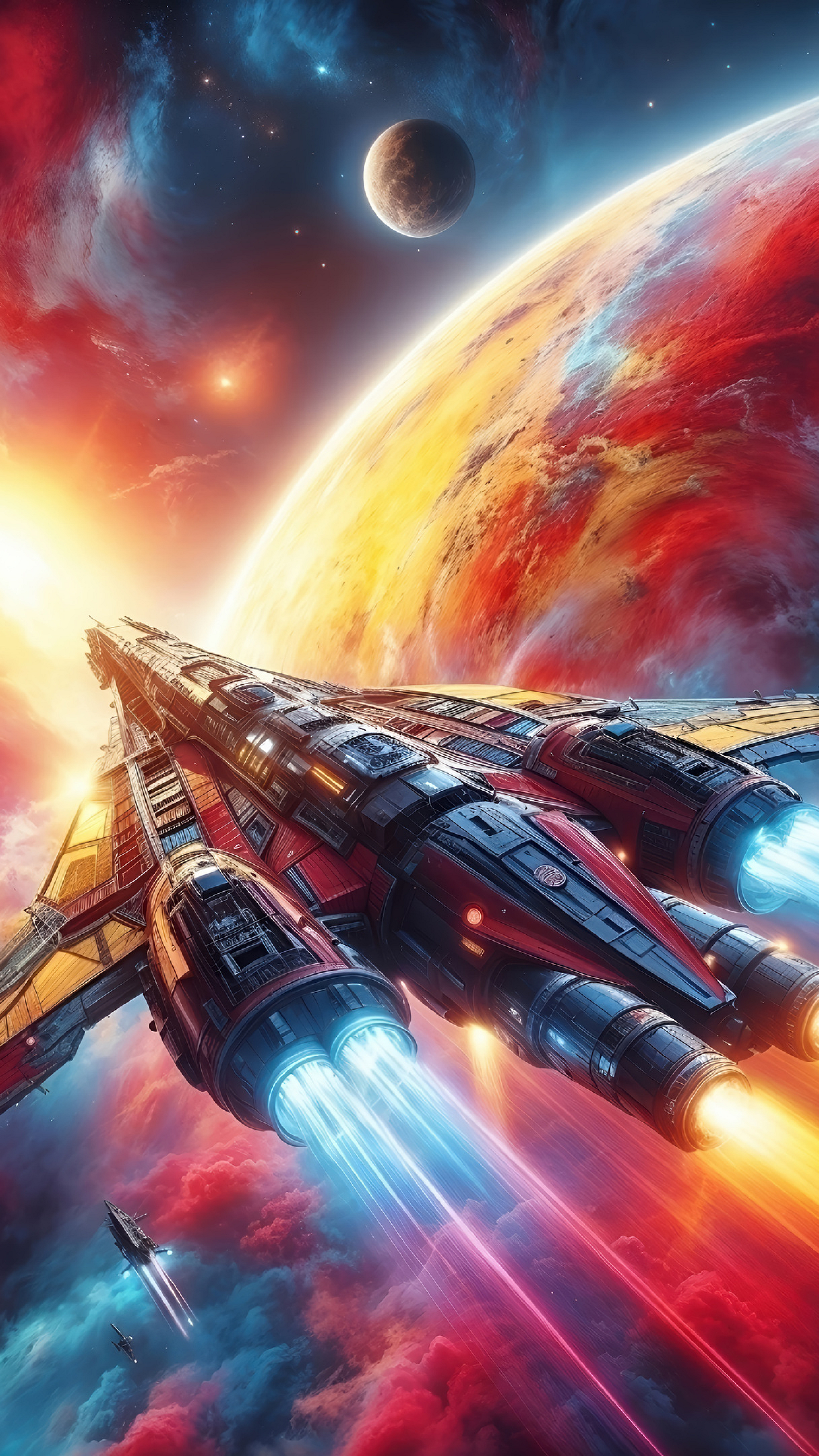 The spaceship is beautifully rendered, showcasing its sleek design and advanced technology. The planet is equally impressive, with its unique atmospheric features and captivating surface details. The overall composition is carefully balanced, creating a sense of wonder and awe.
