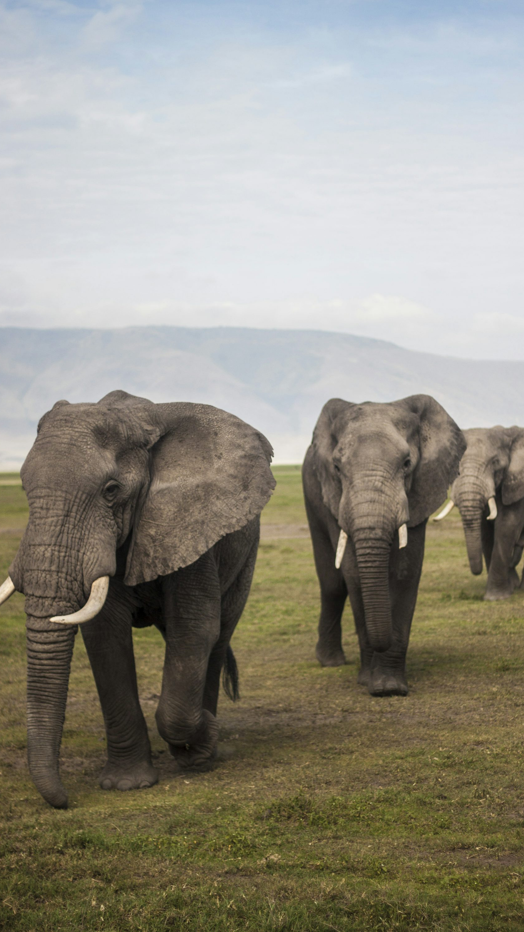 This wallpaper features three elephants gracefully walking across a lush green grass field under the bright daytime sun. The scene evokes a sense of serene wildlife in its natural habitat. The elephants appear calm and peaceful, enjoying their leisurely stroll across the expansive meadow. The image is perfect for those seeking a tranquil and nature-inspired wallpaper for their devices.
